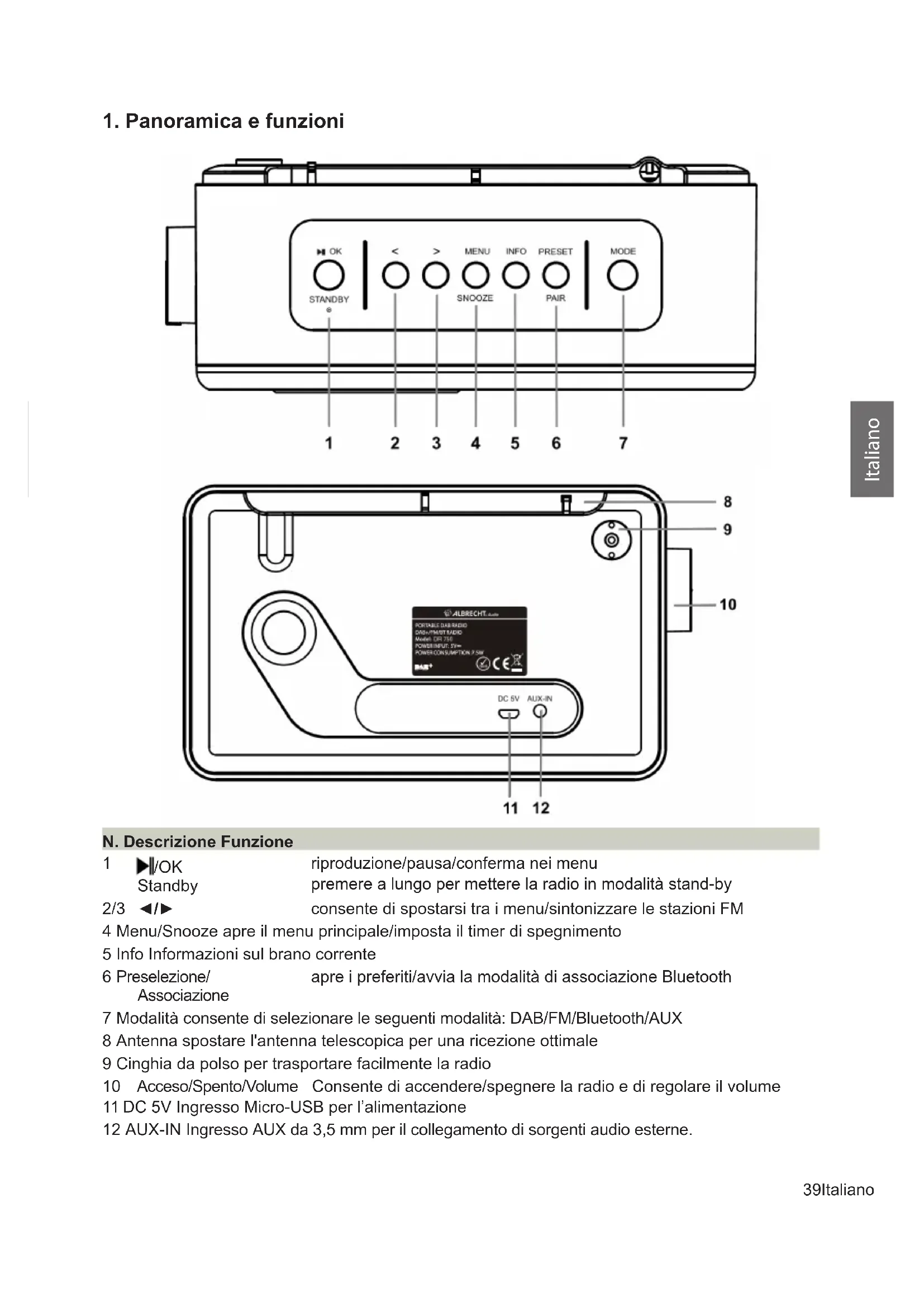 consente di spostarsi tra i menu/sintonizzare le stazioni FM 4 Menu/Snooze apre il menu principale/imposta il timer di spegnimento 5 Info Informazioni sul brano corrente 6 Preselezione/ Associazione apre i preferiti/avvia la modalità di associazione Bluetooth 7 Modalità consente di selezionare le seguenti modalità: DAB/FM/Bluetooth/AUX 8 Antenna spostare l'antenna telescopica per una ricezione ottimale 9 Cinghia da polso per trasportare facilmente la radio 10 Acceso/Spento/Volume Consente di accendere/spegnere la radio e di regolare il volume 11 DC 5V Ingresso Micro-USB per l’alimentazione 12 AUX-IN Ingresso AUX da 3,5 mm per il collegamento di sorgenti audio esterne.40 Italiano Italiano