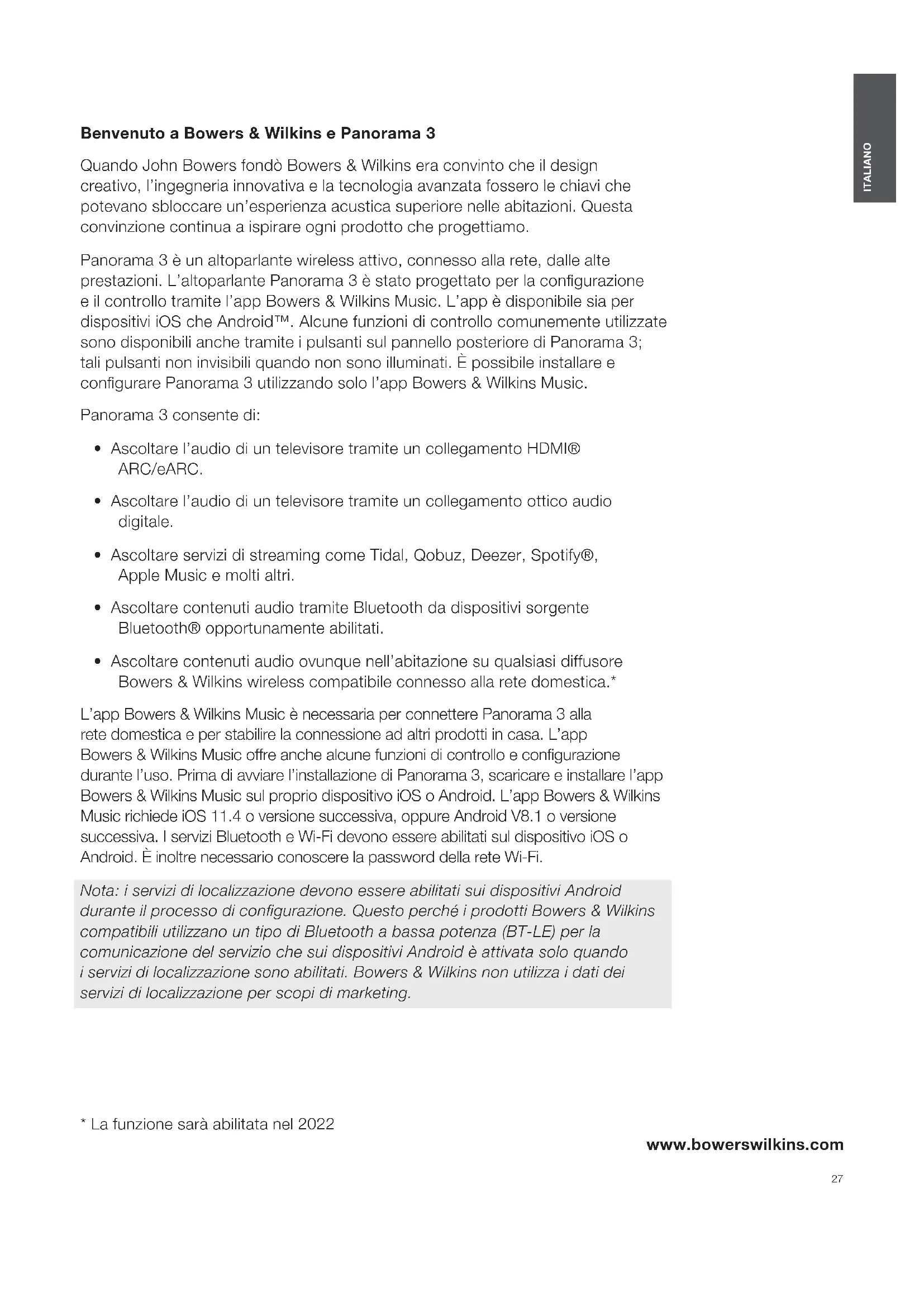 - Ascoltare contenuti audio ovunque nell’abitazione su qualsiasi diffusore Bowers&Wilkins wireless compatibile connesso alla rete domestica.* L’app Bowers&Wilkins Music è necessaria per connettere Panorama3 alla rete domestica e per stabilire la connessione ad altri prodotti in casa. L’app Bowers&Wilkins Music offre anche alcune funzioni di controllo e congurazione durante l’uso. Prima di avviare l’installazione di Panorama3, scaricare e installare l’app Bowers&Wilkins Music sul proprio dispositivo iOS o Android. L’app Bowers&Wilkins Music richiede iOS 11.4 o versione successiva, oppure Android V8.1 o versione successiva. I servizi Bluetooth e Wi-Fi devono essere abilitati sul dispositivo iOS o Android. È inoltre necessario conoscere la password della rete Wi-Fi. Nota: i servizi di localizzazione devono essere abilitati sui dispositivi Android durante il processo di congurazione. Questo perché i prodotti Bowers&Wilkins compatibili utilizzano un tipo di Bluetooth a bassa potenza (BT-LE) per la comunicazione del servizio che sui dispositivi Android è attivata solo quando i servizi di localizzazione sono abilitati. Bowers&Wilkins non utilizza i dati dei servizi di localizzazione per scopi di marketing.