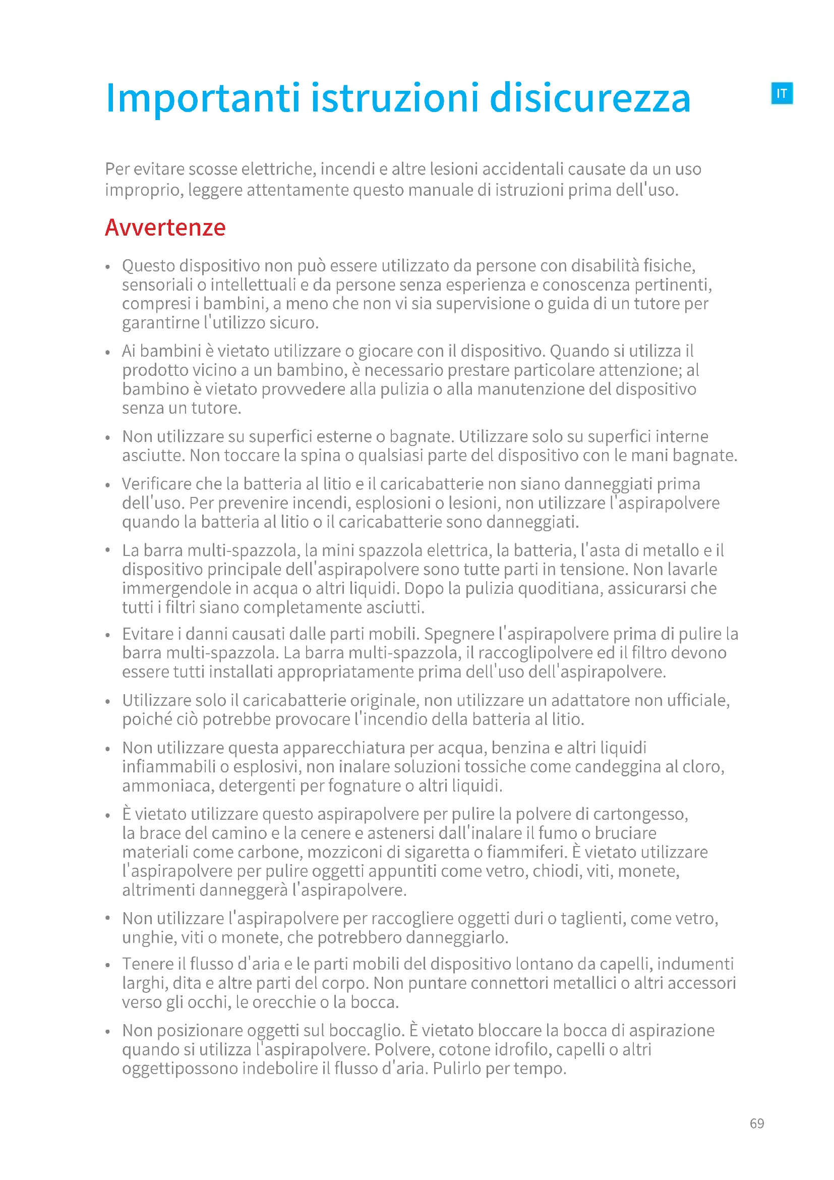 La barra multi-spazzola, la mini spazzola elettrica, la batteria, l'asta di metallo e il dispositivo principale dell'aspirapolvere sono tutte parti in tensione. Non lavarle immergendole in acqua o altri liquidi. Dopo la pulizia quoditiana, assicurarsi che tutti i filtri siano completamente asciutti.