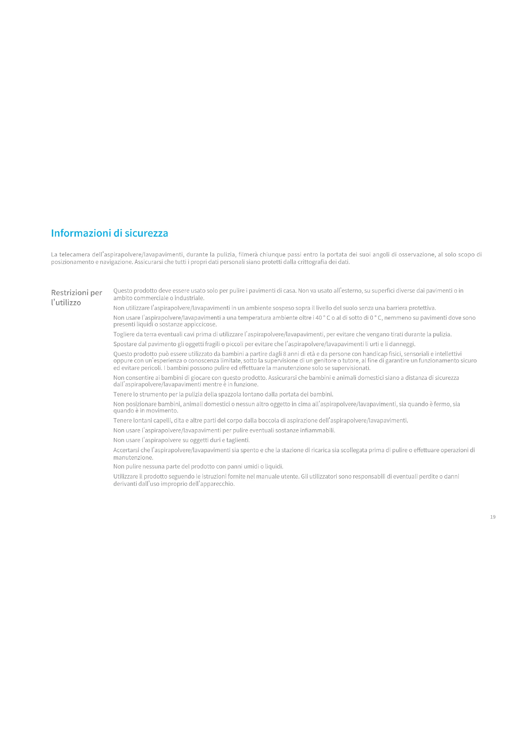 pulire il foro dell'aria nel coperchio del serbatoio dell'acqua. Manutenzione di routine32 Spazzola lateraleSpazzola principale Rovesciare l'aspirapolvere/lavapavimenti e premere sui fermi per rimuovere la protezione della spazzola principale. Sollevare ed estrarre la spazzola principale dall'aspirapolvere/lavapavimenti, quindi pulirne i cuscinetti. Utilizzare lo strumento per la pulizia delle spazzole fornito in dotazione per rimuovere eventuali capelli impigliati nella spazzola. Nota: se c'è una grande quantità di capelli o i capelli sono strettamente aggrovigliati, rimuoverli con cura per evitare danni alla spazzola principale. Rovesciare l'aspirapolvere/lavapavimenti, quindi estrarre con delicatezza la spazzola laterale per pulirla, come mostrato nello schema seguente. Rotella omnidirezionale Rovesciare l'aspirapolvere/lavapavimenti ed estrarre la rotella omnidirezionale. Rimuovere capelli, sporco e qualsiasi altro residuo si trovi sulla rotella e sull'asse. Nota: utilizzare strumenti come un piccolo cacciavite, ecc. per separare l'asse e il pneumatico. Manutenzione di routine33 Usare un panno morbido per pulire tutti i sensori dell'aspirapolvere/ lavapavimenti, compresi: Sensore di navigazione visivo Sensore di decelerazione a infrarossi Sensore di scogliera e sensore ottico Pulire i contatti sulla stazione di ricarica con un panno morbido. Manutenzione di routine34 FAQ Tipo di Problema L'aspirapolvere/lavapavimenti non si accende L'aspirapolvere/lavapavimenti non si ricarica L'aspirapolvere/lavapavimenti non ritorna alla stazione di ricarica L'aspirapolvere/lavapavimenti non funziona bene L'aspirapolvere/lavapavimenti fa uno strano rumore L'aspirapolvere/lavapavimenti non pulisce più con la stessa efficienza di prima o lascia polvere dietro di sé L'aspirapolvere/lavapavimenti non riesce a collegarsi al Wi-Fi Soluzione La stazione di ricarica non riceve alimentazione. Verificare che entrambe le estremità del cavo di alimentazione siano collegate correttamente. Problema sui contatti, Pulire i contatti di ricarica della stazione di ricarica e dell'aspirapolvere/lavapavimenti. Ci sono troppi ostacoli intorno alla stazione di ricarica. Posizionare la stazione di ricarica in una zona più aperta. Pulire l'area di segnalazione della stazione di ricarica. Potrebbe essersi incastrato un corpo estraneo nella spazzola principale, in quella laterale o in una delle rotelle principali. Arrestare l'aspirapolvere/lavapavimenti e rimuovere eventuali residui. Il contenitore della polvere è pieno. Svuotarlo. Il filtro è bloccato. Pulirlo. Un corpo estraneo si è incastrato nella spazzola principale. Eliminarlo. Il segnale Wi-Fi è troppo debole. Assicurarsi che l'aspirapolvere/lavapavimenti sia in una zona all'interno della portata del Wi-Fi. C'è qualcosa che non va con il collegamento Wi-Fi. Effettuare un reset del Wi-Fi e scaricare la versione più recente dell'app, quindi provare a riconnettersi. Spegnere e riaccendere l'aspirapolvere/lavapavimenti. Il livello della batteria è basso. Ricaricare l'aspirapolvere/lavapavimenti sulla stazione di ricarica, quindi riprovare. La temperatura ambiente è troppo bassa (meno di 0°C) o troppo alta (oltre 40℃). La temperatura di funzionamento dell'aspirapolvere/lavapavimenti va da 0 °C a 40 ℃.35 FAQ Tipo di Problema L'aspirapolvere/lavapavimenti ha la batteria scarica. La pulizia programmata avrà inizio soltanto quando l'aspirapolvere/lavapavimenti avrà una carica di batteria pari ad almeno il 15%. Se l'aspirapolvere/lavapavimenti viene lasciato sulla stazione di ricarica dopo una carica completa, il livello di energia consumato sarà molto basso e ciò contribuirà a mantenere prestazioni ottimali per la batteria. Le batterie al litio non soffrono di effetti di memoria, pertanto non è necessario aspettare 16 ore da una carica completa prima di utilizzare l'aspirapolvere/lavapavimenti. L'aspirapolvere/lavapavimenti deve essere ricaricato completamente per 16 ore le prime tre volte in cui viene utilizzato? Dal modulo di pulizia esce troppa acqua Dal modulo di pulizia non esce acqua oppure ne esce poca L'aspirapolvere/lavapavimenti non riprende a pulire dopo la ricarica L'aspirapolvere/lavapavimenti non ritorna sulla stazione di ricarica dopo essere stato spostato Se l'aspirapolvere/lavapavimenti viene lasciato sulla stazione di ricarica, ma è già carica, consumerà energia? Soluzione Accertarsi che il coperchio del serbatoio dell'acqua sia chiuso saldamente. Accertarsi che l'aspirapolvere/lavapavimenti non sia impostato sulla modalità Non Disturbare, che impedirebbe la ripresa della pulizia. L'aspirapolvere/lavapavimenti non riprende a pulire quando viene caricato o posto manualmente sulla stazione di ricarica. Verificare che il serbatoio dell'acqua sia pieno, quindi pulire il panno per lavare, se necessario. Accertarsi che il panno per lavare sia installato correttamente facendo riferimento al manuale dell'utente. Lo spostamento dell'aspirapolvere/lavapavimenti può portare quest'ultimo a posizionarsi altrove o a ridefinire ciò che gli sta intorno. Se l'aspirapolvere/lavapavimenti è troppo lontano dalla stazione di ricarica, potrebbe non riuscire a tornare automaticamente alla stazione di ricarica da solo, nel qual caso sarà necessario posizionarlo manualmente su di essa. L'aspirapolvere/lavapavimenti non effettua la pulizia programmata36 Speciche tecniche Capacità nominale della batteria Connettività wireless Tensione nominale Frequenza d’esercizio 2400-2483,5 MHz Potenza nominale 40 W Potenza in uscita massima <20 dBm Modello RVS5-WH0 14,4 V 5200 mAh Ingresso Uscita nominale RCS0Modello 100-240 V ~ 50/60 Hz 0,5 A 19,8 V 1 A Wi-Fi IEEE 802,11b/g/n 2,4 GHz Informazioni RAEE Tutti i prodotti contrassegnati da questo simbolo sono rifiuti di apparecchiature elettriche ed elettroniche (RAEE in base alla direttiva 2012/19/UE) che non devono essere smaltiti assieme a rifiuti domestici non differenziati. Al contrario, è necessario protegg