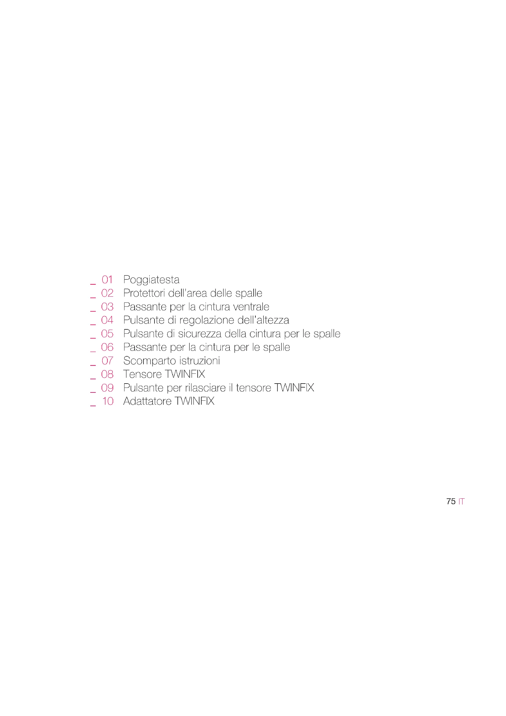 Poggiatesta Protettori dell’area delle spalle Passante per la cintura ventrale Pulsante di regolazione dell’altezza Pulsante di sicurezza della cintura per le spalle Passante per la cintura per le spalle Scomparto istruzioni Tensore TWINFIX Pulsante per rilasciare il tensore TWINFIX Adattatore TWINFIX _ 01 _ 02 _ 03 _ 04 _ 05 _ 06 _ 07 _ 08 _ 09 _ 10 IM 2230.01 TRANSFORMER_iTECH int.indd 75 18/6/21 15:3476