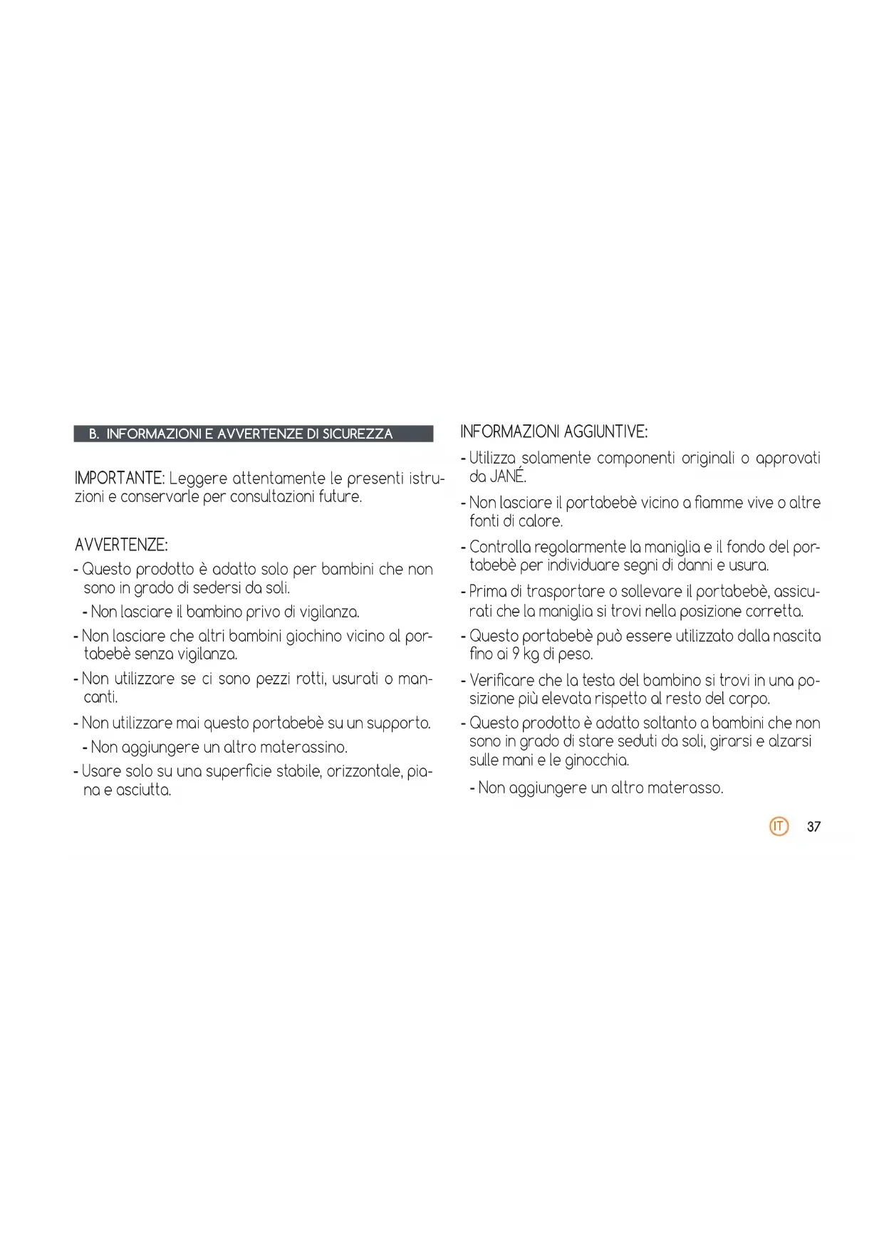 IMPORTANTE: Leggere attentamente le presenti istru- zioni e conservarle per consultazioni future. AVVERTENZE: - Questo prodotto è adatto solo per bambini che non sono in grado di sedersi da soli. - Non lasciare il bambino privo di vigilanza. - Non lasciare che altri bambini giochino vicino al por- tabebè senza vigilanza. - Non utilizzare se ci sono pezzi rotti, usurati o man- canti. - Non utilizzare mai questo portabebè su un supporto. - Non aggiungere un altro materassino. - Usare solo su una supercie stabile, orizzontale, pia- na e asciutta. INFORMAZIONI AGGIUNTIVE: - Utilizza solamente componenti originali o approvati da JANÉ. - Non lasciare il portabebè vicino a amme vive o altre fonti di calore. - Controlla regolarmente la maniglia e il fondo del por- tabebè per individuare segni di danni e usura. - Prima di trasportare o sollevare il portabebè, assicu- rati che la maniglia si trovi nella posizione corretta. - Questo portabebè può essere utilizzato dalla nascita no ai 9 kg di peso. - Vericare che la testa del bambino si trovi in una po- sizione più elevata rispetto al resto del corpo. - Questo prodotto è adatto soltanto a bambini che non sono in grado di stare seduti da soli, girarsi e alzarsi sulle mani e le ginocchia. - Non aggiungere un altro materasso.IT