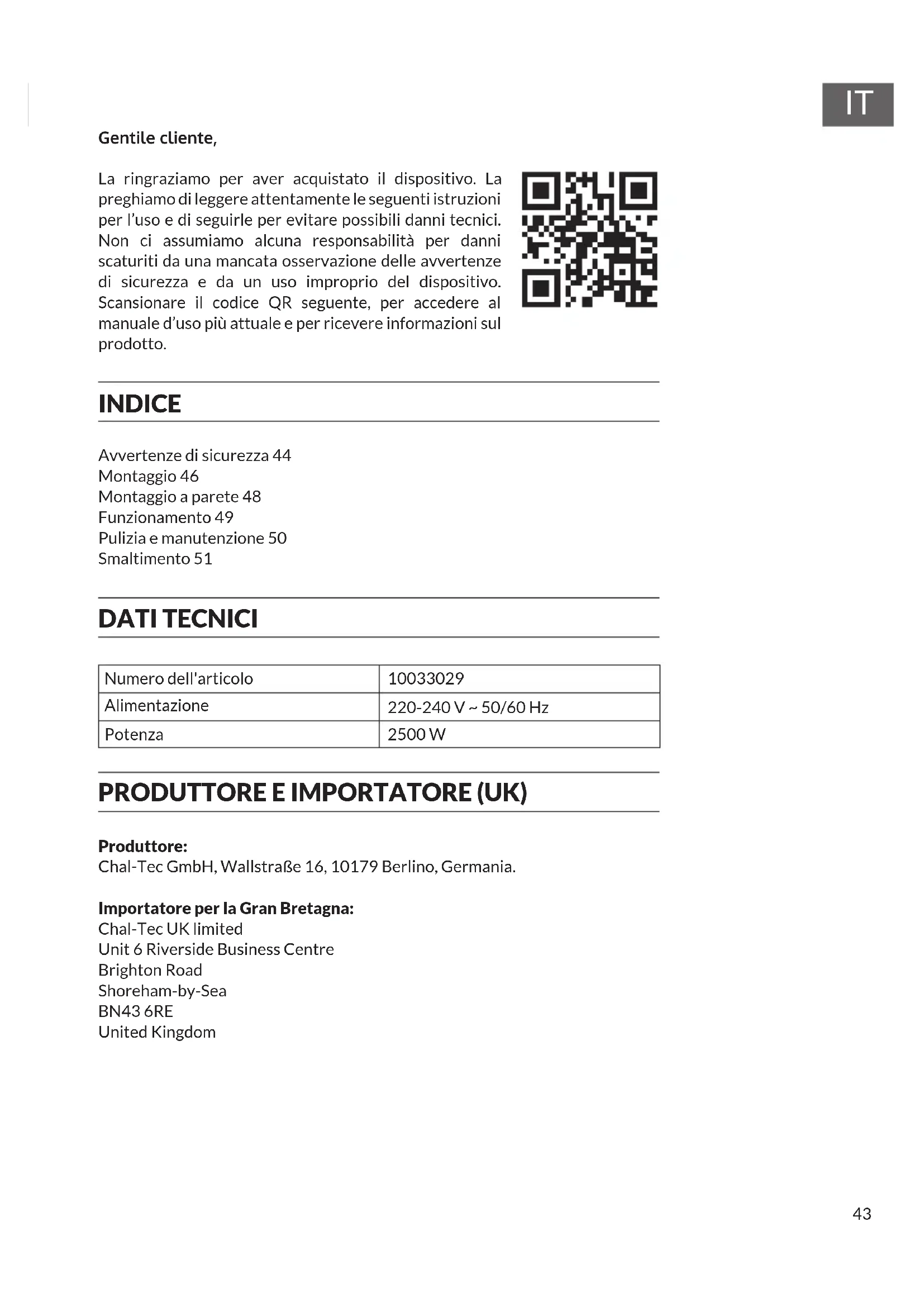 Gentile cliente, La ringraziamo per aver acquistato il dispositivo. La preghiamo di leggere attentamente le seguenti istruzioni per l’uso e di seguirle per evitare possibili danni tecnici. Non ci assumiamo alcuna responsabilità per danni scaturiti da una mancata osservazione delle avvertenze di sicurezza e da un uso improprio del dispositivo. Scansionare il codice QR seguente, per accedere al manuale d’uso più attuale e per ricevere informazioni sul prodotto. INDICE Avvertenze di sicurezza 44 Montaggio 46 Montaggio a parete 48 Funzionamento 49 Pulizia e manutenzione 50 Smaltimento 51 DATI TECNICI Numero dell'articolo