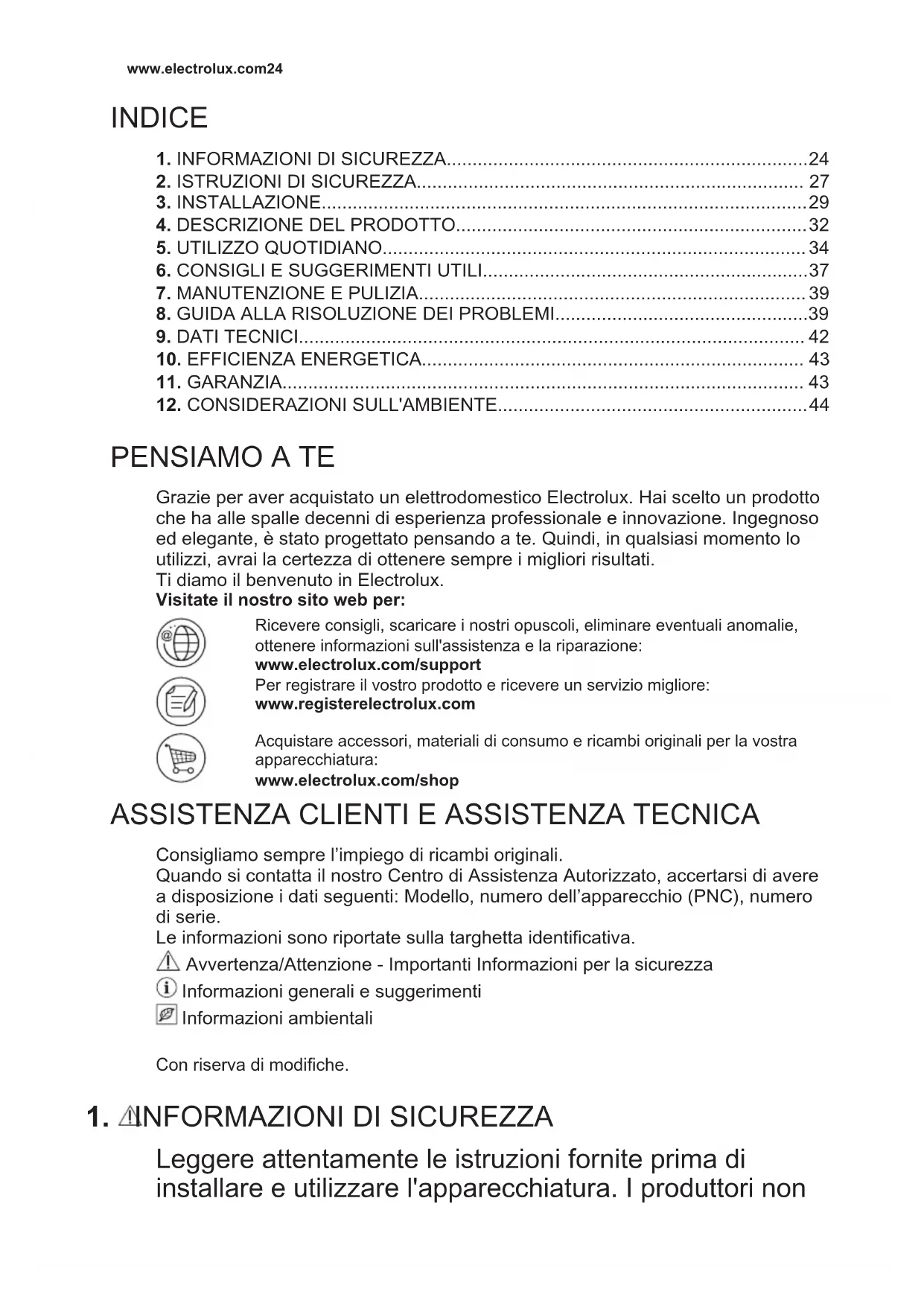 Leggere attentamente le istruzioni fornite prima di installare e utilizzare l'apparecchiatura. I produttori non www.electrolux.com24sono responsabili di eventuali lesioni o danni derivanti da un'installazione o un uso scorretti. Conservare sempre le istruzioni in un luogo sicuro e accessibile per poterle consultare in futuro.