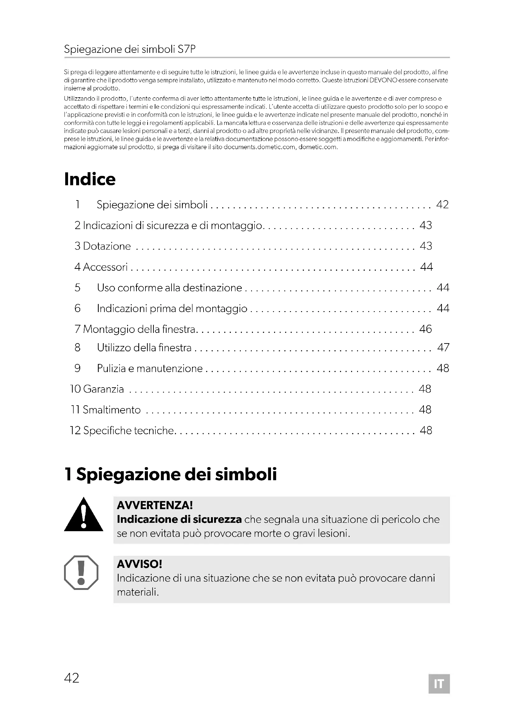 AVVERTENZA! Indicazione di sicurezza che segnala una situazione di pericolo che se non evitata può provocare morte o gravi lesioni. AVVISO! Indicazione di una situazione che se non evitata può provocare danni materiali. DometicS7P_IOM_4445101861_EMEA16_202x-xx-xx.book Page 42 Saturday, July 31, 2021 1:38 PMIT S7P Indicazioni di sicurezza e di montaggio