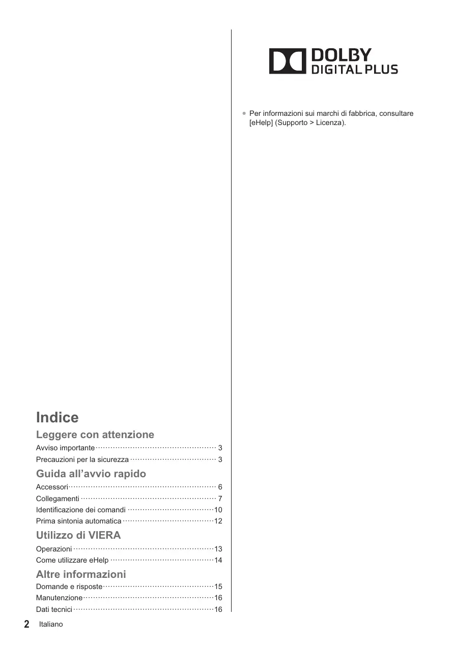 Avviso importante Avviso per le funzioni DVB / trasmissioni di dati / IPTV Questo televisore è progettato in conformità agli standard (aggiornati ad agosto 2014) dei servizi digitali terrestri DVB-T / T2 (MPEG2 e MPEG4AVC(H.264)) e dei servizi digitali via cavo DVB-C (MPEG2 e MPEG4-AVC(H.264)). Per la disponibilità dei servizi DVB-T / T2 nella propria area, rivolgersi al rivenditore locale. Per la disponibilità dei servizi DVB-C con il presente televisore, rivolgersi al provider di servizi via cavo. Questo televisore potrebbe non funzionare correttamente con segnali non conformi agli standard DVB-T / T2 o DVB-C. La disponibilità delle caratteristiche varia a seconda del paese, dell’area geografica, dell’emittente, del provider di servizi e dell’ambiente di rete. Non tutti i moduli CI (interfaccia comune) funzionano correttamente con questo televisore. Rivolgersi al provider di servizi per informazioni sui moduli CI disponibili. Questo televisore potrebbe non funzionare correttamente con i moduli CI non approvati dal provider di servizi. A seconda del provider di servizi, possono essere applicate tariffe aggiuntive. La compatibilità con i servizi futuri non è garantita. Controllare le informazioni più aggiornate sui servizi disponibili sul sito Web indicato di seguito. (Solo in inglese) http://panasonic.net/viera/support