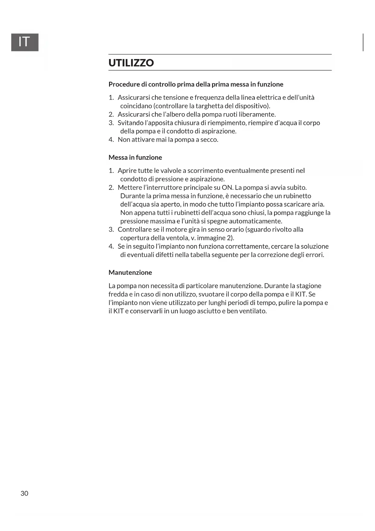 di eventuali difetti nella tabella seguente per la correzione degli errori. Manutenzione La pompa non necessita di particolare manutenzione. Durante la stagione fredda e in caso di non utilizzo, svuotare il corpo della pompa e il KIT. Se l’impianto non viene utilizzato per lunghi periodi di tempo, pulire la pompa e il KIT e conservarli in un luogo asciutto e ben ventilato.31