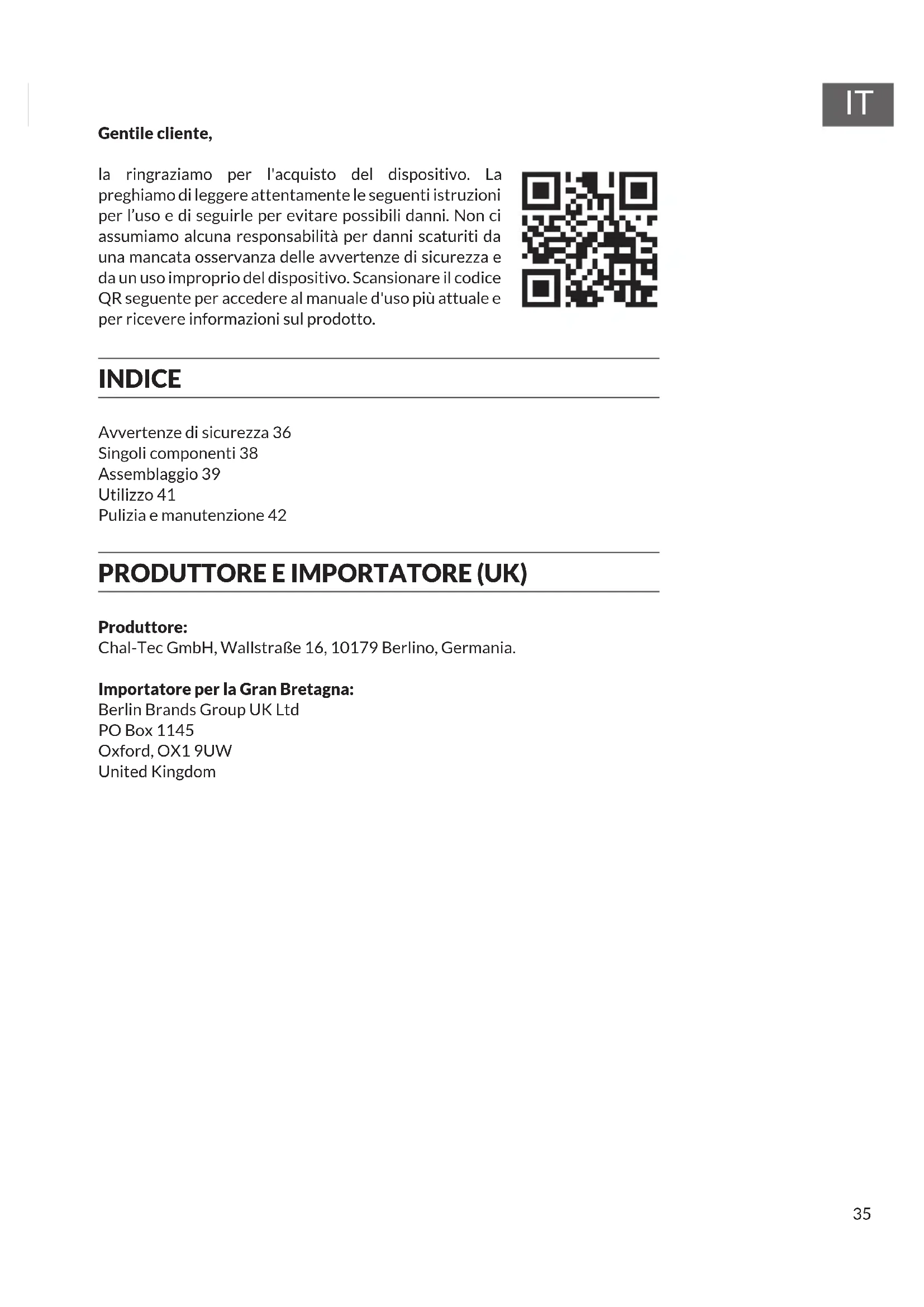 Gentile cliente, la ringraziamo per l'acquisto del dispositivo. La preghiamo di leggere attentamente le seguenti istruzioni per l’uso e di seguirle per evitare possibili danni. Non ci assumiamo alcuna responsabilità per danni scaturiti da una mancata osservanza delle avvertenze di sicurezza e da un uso improprio del dispositivo. Scansionare il codice QR seguente per accedere al manuale d'uso più attuale e per ricevere informazioni sul prodotto. INDICE Avvertenze di sicurezza 36 Singoli componenti 38 Assemblaggio 39 Utilizzo 41 Pulizia e manutenzione 42 PRODUTTORE E IMPORTATORE (UK) Produttore: Chal-Tec GmbH, Wallstraße 16, 10179 Berlino, Germania. Importatore per la Gran Bretagna: Berlin Brands Group UK Ltd PO Box 1145 Oxford, OX1 9UW United Kingdom36