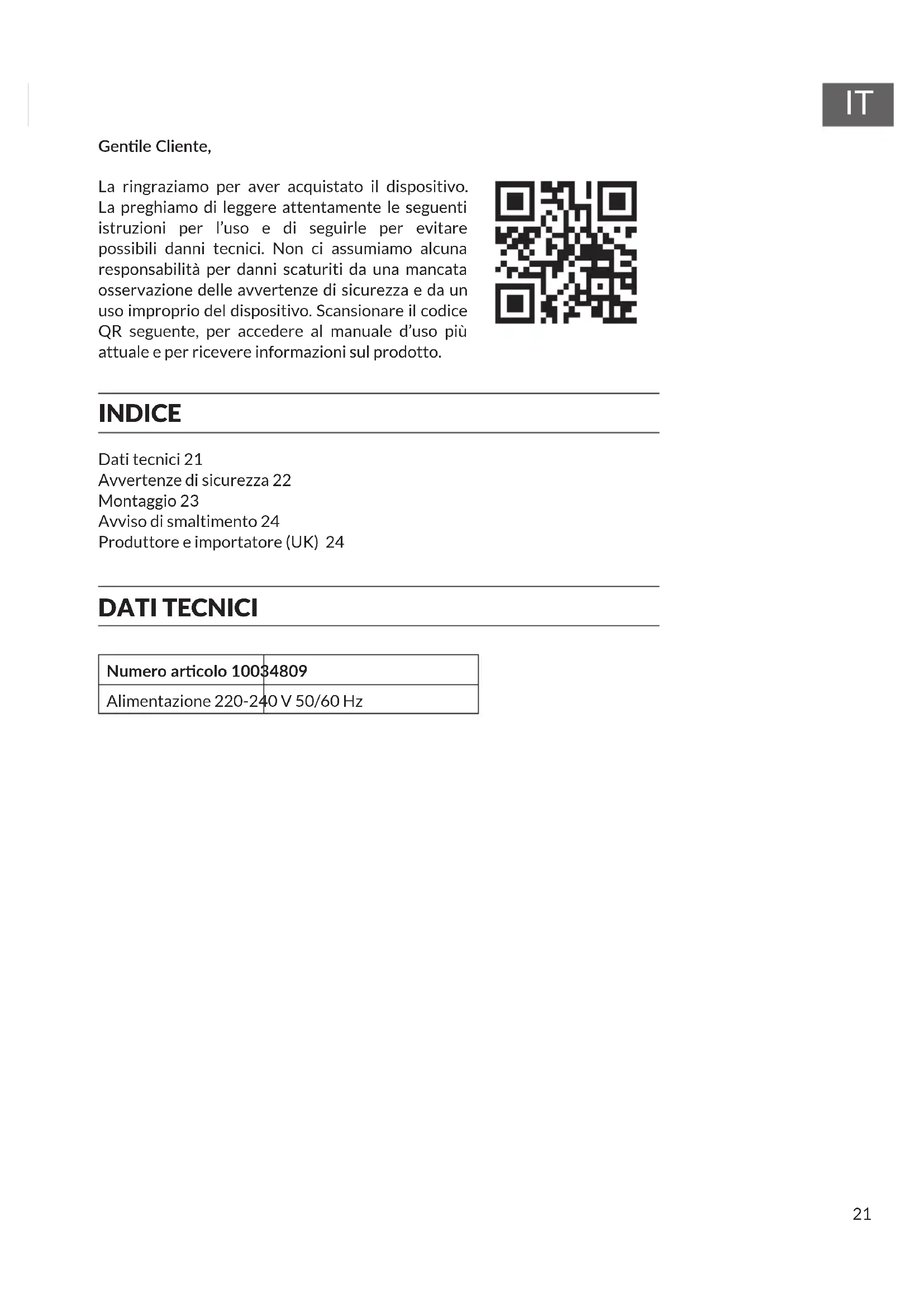 Genle Cliente, La ringraziamo per aver acquistato il dispositivo. La preghiamo di leggere attentamente le seguenti istruzioni per l’uso e di seguirle per evitare possibili danni tecnici. Non ci assumiamo alcuna responsabilità per danni scaturiti da una mancata osservazione delle avvertenze di sicurezza e da un uso improprio del dispositivo. Scansionare il codice QR seguente, per accedere al manuale d’uso più attuale e per ricevere informazioni sul prodotto. INDICE Dati tecnici 21 Avvertenze di sicurezza 22 Montaggio 23 Avviso di smaltimento 24 Produttore e importatore (UK) 24 DATI TECNICI Numero arcolo 10034809 Alimentazione 220-240 V 50/60 Hz22