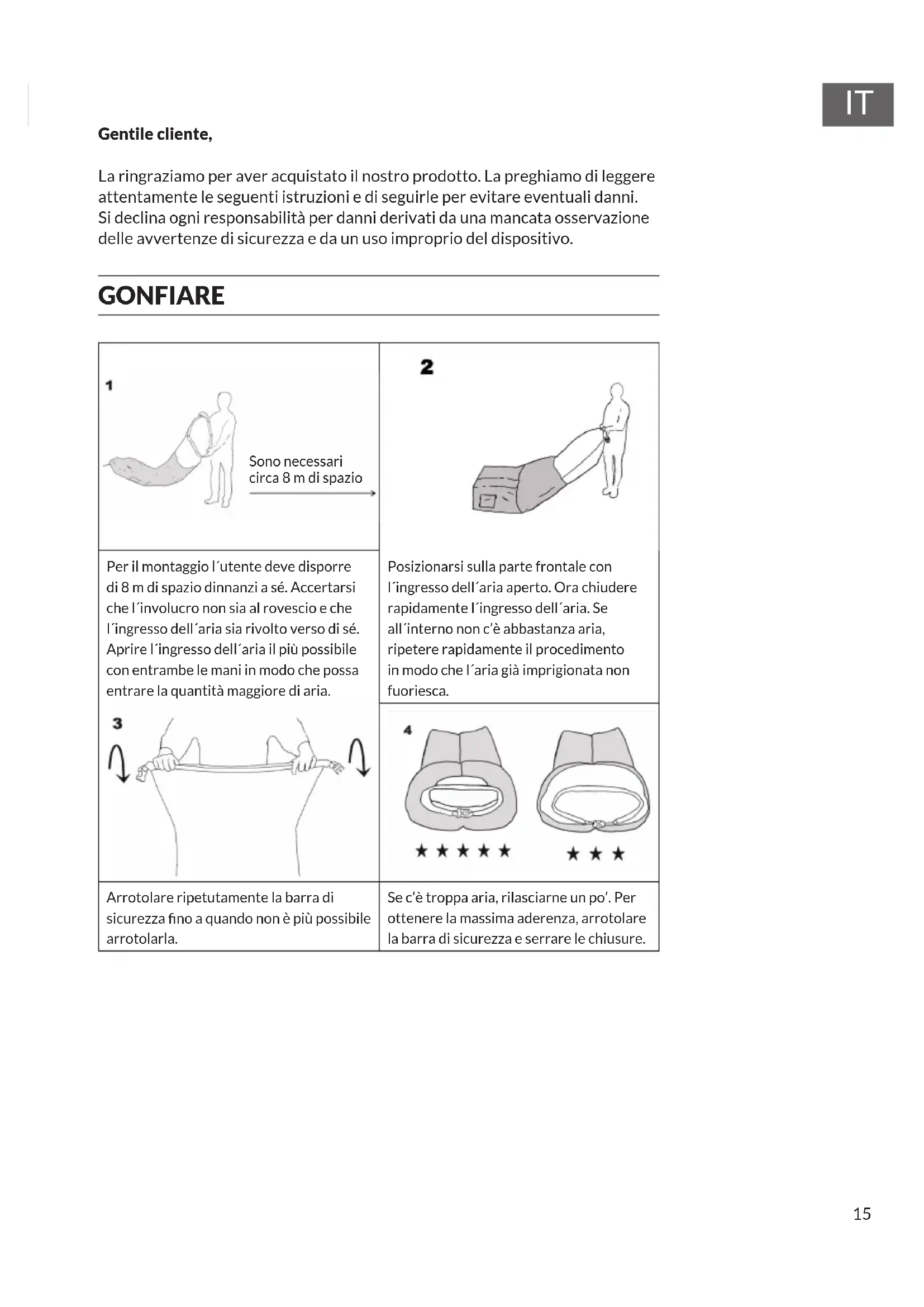 Gentile cliente, La ringraziamo per aver acquistato il nostro prodotto. La preghiamo di leggere attentamente le seguenti istruzioni e di seguirle per evitare eventuali danni. Si declina ogni responsabilità per danni derivati da una mancata osservazione delle avvertenze di sicurezza e da un uso improprio del dispositivo. GONFIARE Per il montaggio l´utente deve disporre di 8 m di spazio dinnanzi a sé. Accertarsi che l´involucro non sia al rovescio e che l´ingresso dell´aria sia rivolto verso di sé. Aprire l´ingresso dell´aria il più possibile con entrambe le mani in modo che possa entrare la quantità maggiore di aria. Posizionarsi sulla parte frontale con l´ingresso dell´aria aperto. Ora chiudere rapidamente l´ingresso dell´aria. Se all´interno non c’è abbastanza aria, ripetere rapidamente il procedimento in modo che l´aria già imprigionata non fuoriesca. Arrotolare ripetutamente la barra di sicurezza no a quando non è più possibile arrotolarla. Se c’è troppa aria, rilasciarne un po’. Per ottenere la massima aderenza, arrotolare la barra di sicurezza e serrare le chiusure. Sono necessari circa 8 m di spazio16