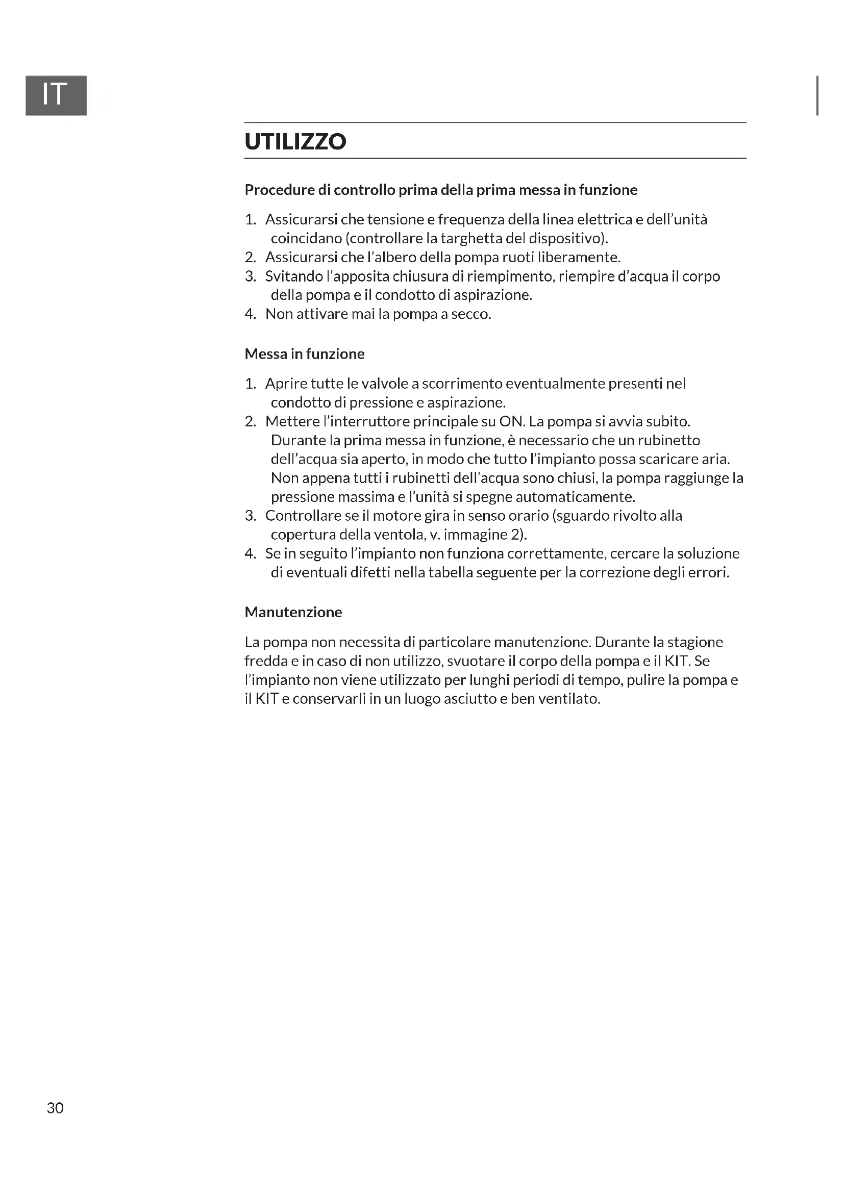 di eventuali difetti nella tabella seguente per la correzione degli errori. Manutenzione La pompa non necessita di particolare manutenzione. Durante la stagione fredda e in caso di non utilizzo, svuotare il corpo della pompa e il KIT. Se l’impianto non viene utilizzato per lunghi periodi di tempo, pulire la pompa e il KIT e conservarli in un luogo asciutto e ben ventilato.31