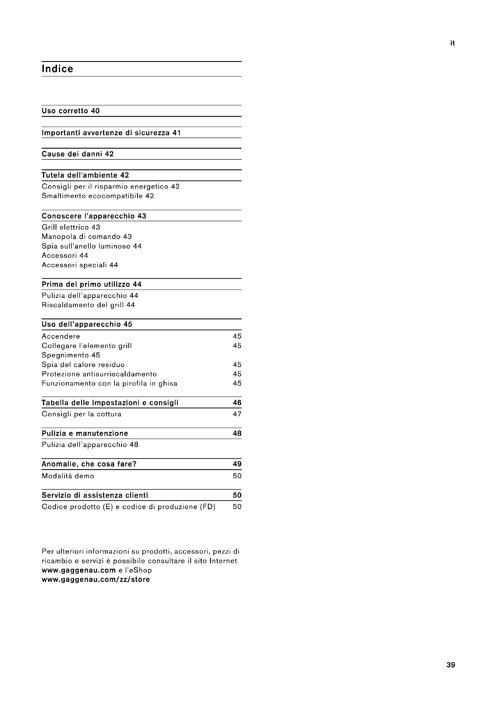 Indice Istruzioni per l’uso Uso corretto 40 Importanti avvertenze di sicurezza 41 Cause dei danni 42 Tutela dell'ambiente 42 Consigli per il risparmio energetico 42 Smaltimento ecocompatibile 42 Conoscere l'apparecchio 43 Grill elettrico 43 Manopola di comando 43 Spia sull'anello luminoso 44 Accessori 44 Accessori speciali 44 Prima del primo utilizzo 44 Pulizia dell’apparecchio 44 Riscaldamento del grill 44 Uso dell’apparecchio 45 Accendere 45 Collegare l'elemento grill 45 Spegnimento 45 Spia del calore residuo 45 Protezione antisurriscaldamento 45 Funzionamento con la pirofila in ghisa 45 Tabella delle impostazioni e consigli 46 Consigli per la cottura 47 Pulizia e manutenzione 48 Pulizia dell’apparecchio 48 Anomalie, che cosa fare? 49 Modalità demo 50 Servizio di assistenza clienti 50 Codice prodotto (E) e codice di produzione (FD) 50 Per ulteriori informazioni su prodotti, accessori, pezzi di ricambio e servizi è possibile consultare il sito Internet www.gaggenau.com e l'eShop www.gaggenau.com/zz/store40 it Uso corretto Uso corretto Uso corretto Leggere attentamente le presenti istruzioni per l'uso. Solo così è possibile utilizzare l'apparecchio in modo sicuro e corretto. Custodire con la massima cura le presenti istruzioni per l'uso e il montaggio in caso di un utilizzo futuro o cessione a terzi. Controllare l'apparecchio dopo averlo disimballato. Qualora si fossero verificati danni da trasporto, non collegare l'apparecchio. Questo apparecchio deve essere installato secondo le istruzioni per il montaggio fornite. L'allacciamento senza spina dell'apparecchio può essere effettuato solo da un tecnico autorizzato. In caso di danni causati da un allacciamento non corretto, decade il diritto di garanzia. Questo apparecchio è pensato esclusivamente per l'utilizzo in abitazioni private e in ambito domestico. Utilizzare l'apparecchio esclusivamente per la preparazione di cibi e bevande. Il processo di cottura deve essere sorvegliato. Un processo di cottura breve va sorvegliato continuamente. Utilizzare l'apparecchio esclusivamente in luoghi chiusi. Questo apparecchio non deve essere installato su barche o veicoli. Questo apparecchio è progettato solo per l'utilizzo fino ad un'altezza di massimo 2000metri sul livello del mare. Non utilizzare dispositivi di protezione o griglie di protezione per bambini non adatti. Potrebbero causare incidenti. Questo apparecchio non è da utilizzare con un timer esterno o un telecomando separato. Questo apparecchio può essere utilizzato da bambini di età pari o superiore a 8 anni e da persone con ridotte facoltà fisiche, sensoriali o mentali nonché da persone prive di sufficiente esperienza o conoscenza dello stesso se sorvegliate da una persona responsabile della loro sicurezza o se istruite in merito all'utilizzo sicuro dell'apparecchio e consapevoli degli eventuali rischi derivanti da un utilizzo improprio. I bambini non devono utilizzare l'apparecchio come un giocattolo. I bambini non devono né pulire né utilizzare l'apparecchio da soli a meno che non abbiano un'età superiore agli 15 anni e che siano assistiti da parte di un adulto. Tenere lontano dall'apparecchio e dal cavo di alimentazione i bambini di età inferiore agli 8 anni.41 Importanti avvertenze di sicurezza