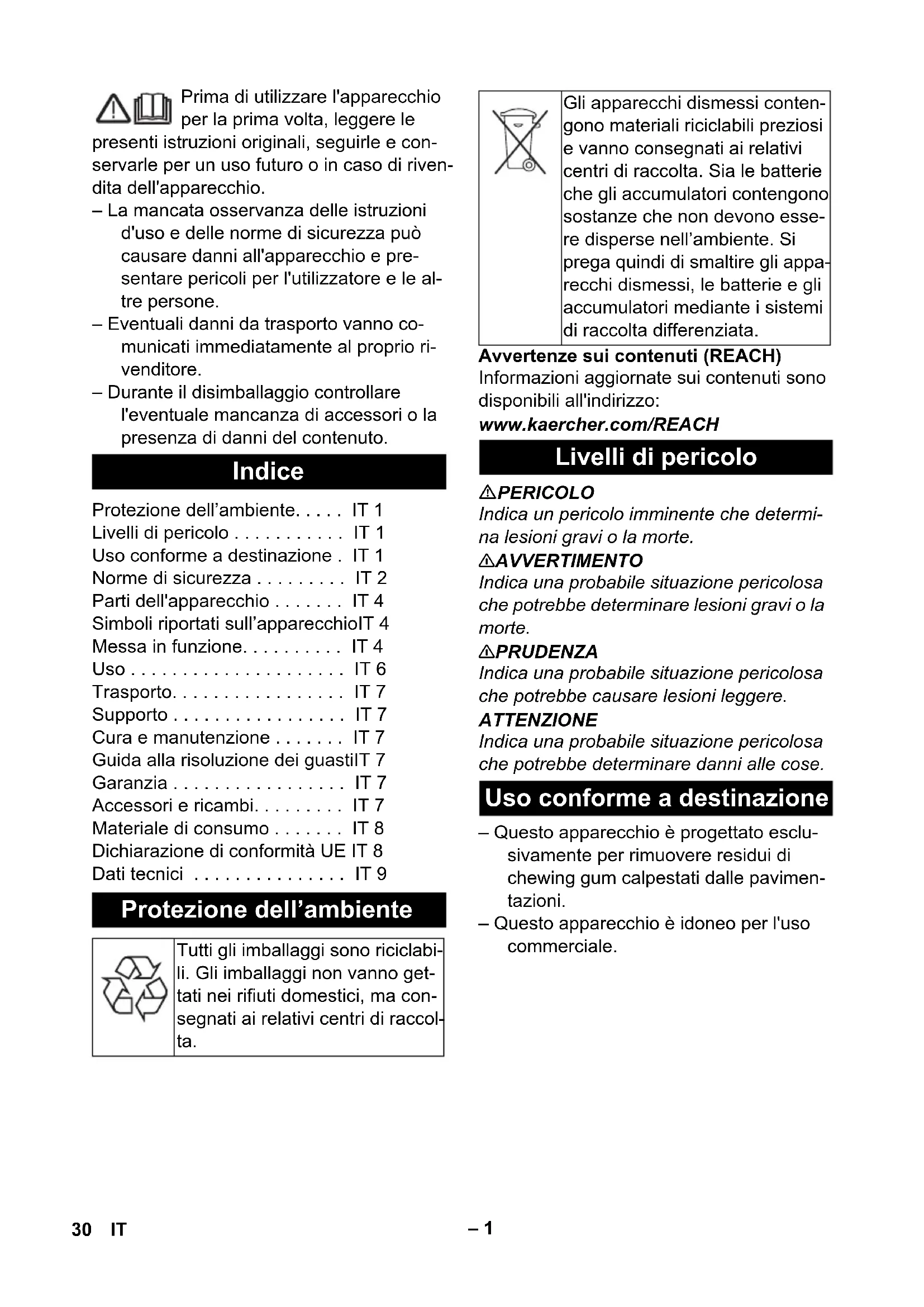 dB(A) ≤70 29FR– 1 Prima di utilizzare l'apparecchio per la prima volta, leggere le presenti istruzioni originali, seguirle e con- servarle per un uso futuro o in caso di riven- dita dell'apparecchio. – La mancata osservanza delle istruzioni d'uso e delle norme di sicurezza può causare danni all'apparecchio e pre- sentare pericoli per l'utilizzatore e le al- tre persone. – Eventuali danni da trasporto vanno co- municati immediatamente al proprio ri- venditore. – Durante il disimballaggio controllare l'eventuale mancanza di accessori o la presenza di danni del contenuto. Avvertenze sui contenuti (REACH) Informazioni aggiornate sui contenuti sono disponibili all'indirizzo: www.kaercher.com/REACH PERICOLO Indica un pericolo imminente che determi- na lesioni gravi o la morte. 몇 AVVERTIMENTO Indica una probabile situazione pericolosa che potrebbe determinare lesioni gravi o la morte. 몇 PRUDENZA Indica una probabile situazione pericolosa che potrebbe causare lesioni leggere. ATTENZIONE Indica una probabile situazione pericolosa che potrebbe determinare danni alle cose. – Questo apparecchio è progettato esclu- sivamente per rimuovere residui di chewing gum calpestati dalle pavimen- tazioni. – Questo apparecchio è idoneo per l'uso commerciale. Indice Protezione dell’ambiente... IT 1 Livelli di pericolo ... IT 1 Uso conforme a destinazione . IT 1 Norme di sicurezza ... IT 2 Parti dell'apparecchio ... IT 4 Simboli riportati sull’apparecchioIT 4 Messa in funzione... IT 4 Uso ... IT 6 Trasporto... IT 7 Supporto ... IT 7 Cura e manutenzione ... IT 7 Guida alla risoluzione dei guastiIT 7 Garanzia ... IT 7 Accessori e ricambi... IT 7 Materiale di consumo ... IT 8 Dichiarazione di conformità UE IT 8 Dati tecnici ... IT 9 Protezione dell’ambiente Tutti gli imballaggi sono riciclabi- li. Gli imballaggi non vanno get- tati nei rifiuti domestici, ma con- segnati ai relativi centri di raccol- ta. Gli apparecchi dismessi conten- gono materiali riciclabili preziosi e vanno consegnati ai relativi centri di raccolta. Sia le batterie che gli accumulatori contengono sostanze che non devono esse- re disperse nell’ambiente. Si prega quindi di smaltire gli appa- recchi dismessi, le batterie e gli accumulatori mediante i sistemi di raccolta differenziata. Livelli di pericolo Uso conforme a destinazione 30 IT– 2 – Oltre alle indicazioni del manuale d’uso è necessario osservare le norme di si- curezza e antinfortunistiche generali vi- genti. – Le targhette di avvertimento sull'appa- recchio forniscono importanti indicazio- ni per un uso sicuro. PERICOLO Pericolo di lesioni! – Utilizzare sempre l’apparecchio confor- memente alla destinazione d’uso te- nendo in considerazione le condizioni locali e prestando attenzione durante il lavoro all’eventuale presenza di terzi, soprattutto bambini. – Non lasciare mai l’apparecchio incusto- dito quando è in funzione. – L'apparecchio deve essere utilizzato solo da persone istruite sul rispettivo uso o che hanno dato prova di sapere utilizzare l'apparecchio ed espressa- mente incaricate dell'uso. È vietato l'im- piego dell'apparecchio da parte di bam- bini o adolescenti. – Questo apparecchio non è indicato ad essere utilizzato da persone con limita- te capacità fisiche, sensoriali o mentali. – I bambini devono essere sorvegliati af- finché non giochino con l'apparecchio. – Lavorare sull'apparecchio indossando sempre guanti protettivi idonei. – È vietato apportare modifiche all'appa- recchio/accessori. – Per escludere qualsiasi rischio, gli inter- venti di riparazione e il montaggio dei pezzi di ricambio vanno effettuati esclu- sivamente dal servizio assistenza auto- rizzato. – Tenere le pellicole di imballaggio fuori dalla portata dei bambini. Pericolo di asfissia! PERICOLO – Ai portatori di pacemaker consigliamo di informarsi presso il proprio medico di fiducia o la casa produttrice del pace- maker su eventuali misure cautelative da intraprendere prima di usare l'appa- recchio. – Non tutti i modelli di pacemaker sono isolati allo stesso modo contro i raggi di campi magnetici ad alta frequenza/elet- trici nelle immediate vicinanze. Tale cir- costanza potrebbe comportare dei pro- blemi durante il funzionamento dell'ap- parecchio. – Nel caso in cui il medico non dovesse garantire l'esclusione di qualsiasi tipo di rischio, si prega di non utilizzare l'appa- recchio! PERICOLO – E' consentito ricaricare l'accumulatore solamente con il caricabatterie originale fornito in dotazione. – Prima di ogni utilizzo controllare che il caricabatterie non sia danneggiato. Se il caricabatterie è danneggiato non usarlo più e far riparare i componenti danneggiati soltanto da personale spe- cializzato. – Non utilizzare il caricabatterie sporco o bagnato. – La tensione indicata sulla targhetta del caricabatterie deve corrispondere alla tensione di rete. – Non utilizzare il caricabatterie in am- bienti a rischio d'esplosione. – Sui contatti del connettore di carica non devono essere presenti particelle me- talliche, pericolo di cortocircuiti. – Evitare il contato con il liquido che fuori- esce da accumulatori danneggiati. Sciacquare eventualmente con acqua il liquido toccato accidentalmente. In caso di contatto con gli occhi ricorrere inoltre all’assistenza di un medico. Norme di sicurezza Pacemaker Caricabatterie 31IT– 3 – L'accumulatore è progettato per essere ricaricato completamente prima di ogni utilizzo. PERICOLO – Leggere le avvertenze di sicurezza sul- le cartucce del gas. – Proteggere dalle radiazioni solari diret- te. – Non esporre a temperature superiori a 50 °C. – Non ricaricare. – Non forare o incenerire. – Eseguire la sostituzione delle cartucce del gas solamente in luoghi ben ventilati in cui non siano presenti fonti di innesco. – Se le guarnizioni del tubo con valvola sono danneggiate o sono state smarrite sostituirle immediatamente. – Avvitarle nel tubo con valvola solo ma- nu