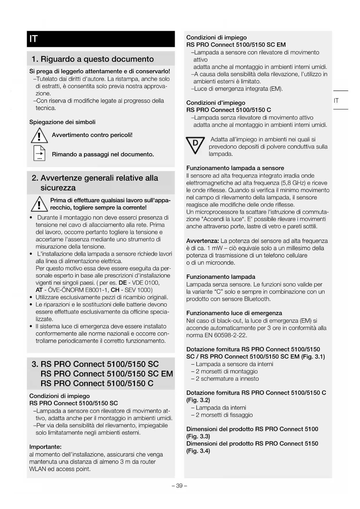 RS PRO Connect 5100/5150 SC EM RS PRO Connect 5100/5150 C Condizioni di impiego RS PRO Connect 5100/5150 SC – Lampada a sensore con rilevatore di movimento at- tivo, adatta anche per il montaggio in ambienti umidi. – Per via della sensibilità del rilevamento, impiegabile solo limitatamente negli ambienti esterni. Importante: al momento dell’installazione, assicurarsi che venga mantenuta una distanza di almeno 3 m da router WLAN ed access point. Condizioni di impiego RS PRO Connect 5100/5150 SC EM – Lampada a sensore con rilevatore di movimento attivo adatta anche al montaggio in ambienti interni umidi. – A causa della sensibilità della rilevazione, l’utilizzo in ambienti esterni è limitato. – Luce di emergenza integrata (EM). Condizioni d’impiego RS PRO Connect 5100/5150 C – Lampada senza rilevatore di movimento attivo adatta anche al montaggio in ambienti interni umidi. Adatta all’impiego in ambienti nei quali si prevedono depositi di polvere conduttiva sulla lampada. Funzionamento lampada a sensore Il sensore ad alta frequenza integrato irradia onde elettromagnetiche ad alta frequenza (5,8 GHz) e riceve le onde riflesse. Quando si verifica il minimo movimento nel campo di rilevamento della lampada, il sensore reagisce alle modifiche delle onde riflesse. Un microprocessore fa scattare l'istruzione di commuta- zione "Accendi la luce“. E' possibile rilevare i movimenti anche attraverso porte, lastre di vetro e pareti sottili. Avvertenza: La potenza del sensore ad alta frequenza è di ca. 1mW – ciò equivale solo a un millesimo della potenza di trasmissione di un telefono cellulare o di un microonde. Funzionamento lampada Lampada senza sensore. Le funzioni sono valide per la variante “C” solo e sempre in combinazione con un prodotto con sensore Bluetooth. Funzionamento luce di emergenza Nel caso di black-out, la luce di emergenza (EM) si accende automaticamente per 3 ore in conformità alla norma EN 60598-2-22. Dotazione fornitura RS PRO Connect 5100/5150 SC / RS PRO Connect 5100/5150 SC EM (Fig.3.1) – Lampada a sensore da interni – 2 morsetti di montaggio – 2 schermature a innesto Dotazione fornitura RS PRO Connect 5100/5150 C (Fig.3.2) – Lampada da interni – 2 morsetti di fissaggio Dimensioni del prodotto RS PRO Connect 5100 (Fig.3.3) Dimensioni del prodotto RS PRO Connect 5150 (Fig.3.4) IT– 40 – Panoramica del prodotto RS PRO Connect 5100/5150 SC /RS PRO Connect 5100/5150 SC EM (Fig.3.5) A Passacavo a vite B Tappo a vite C Morsetto di allacciamento D Morsetto di montaggio E Cappucci terminali F Involucro della lampada G Sensore HF H Schermatura a innesto Panoramica del prodotto RS PRO Connect 5100/5150 C (Fig.3.6) A Pressacavo B Fissaggio a rotazione C Morsetto di allacciamento D Morsetto di fissaggio E Calotte di copertura estremità F Copertura della lampada Campo di rilevamento montaggio a soffitto Ø 1-10m (Fig.3.7) Campo di rilevamento montaggio a parete Ø 1-10m (Fig.3.8) Distribuzione dell’intensità luminosa (Fig.3.9 - 3.14)