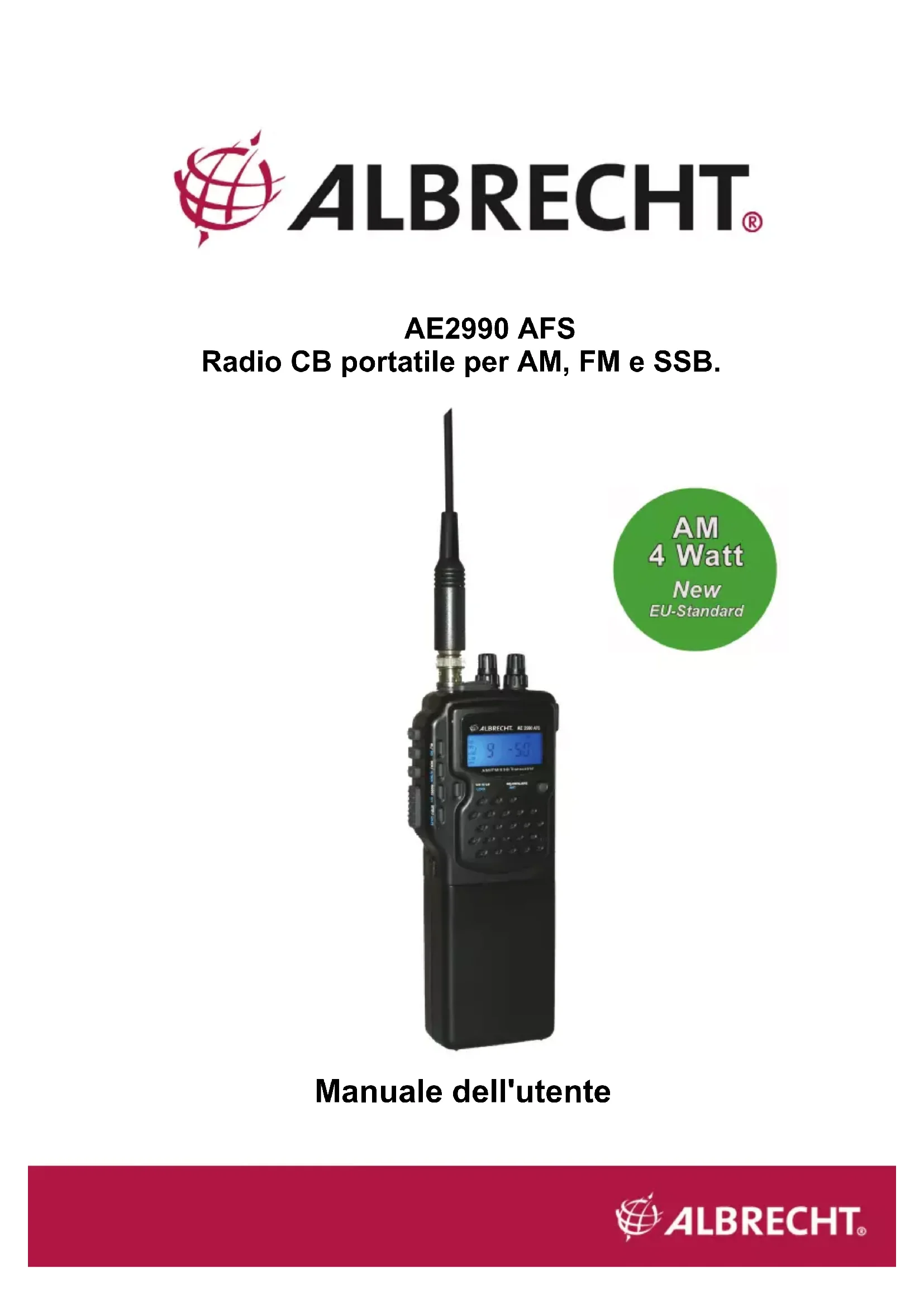 Manuale dell'utente56 Generale. La radio Portatile Albrecht AE 2990 AFS è un Radio CB multi-Standard, che può essere utilizzata con tutti gli standard CB utilizzati in Europa. La radio può essere utilizzata come radio portatile con batterie ricaricabili, ma anche come radio mobile con alimentatore mobile opzionale o come stazione base CB in collegamento con un'antenna esterna ed una fonte di alimentazione esterna.