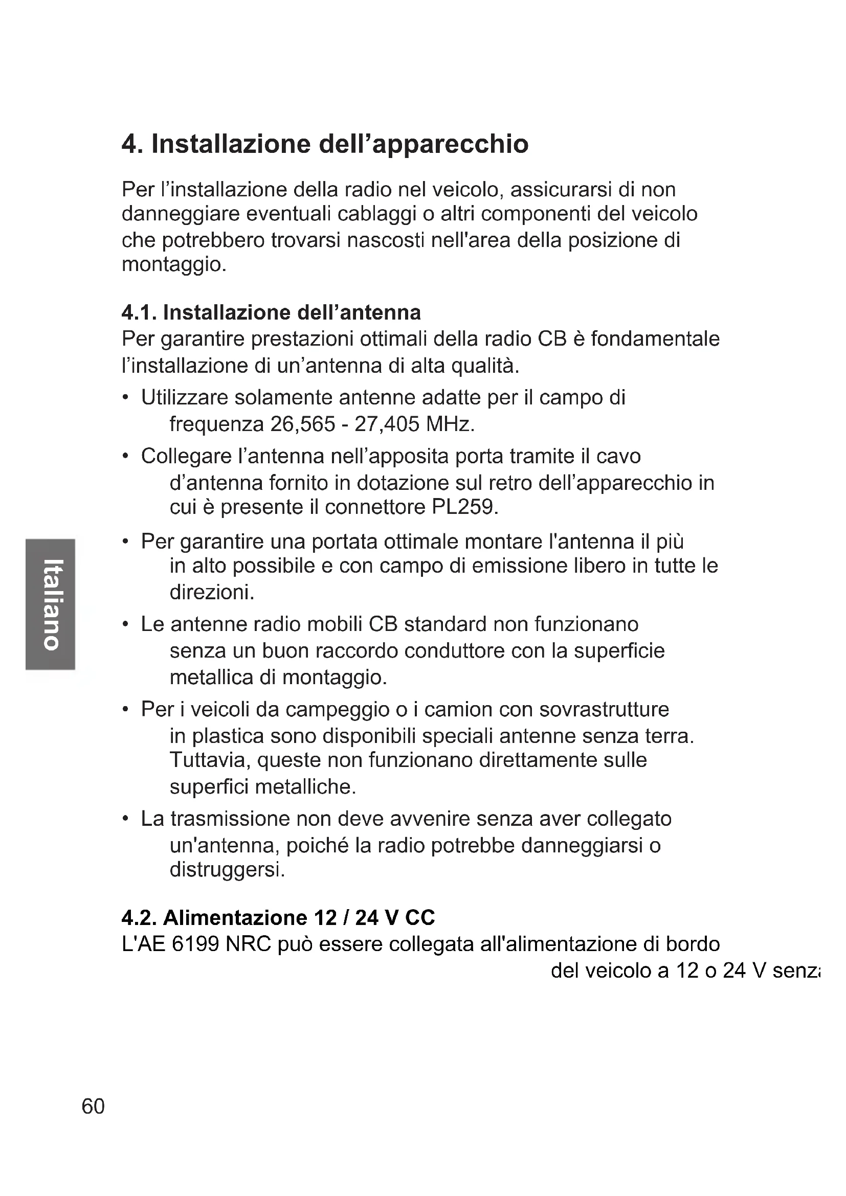 - La trasmissione non deve avvenire senza aver collegato un'antenna, poiché la radio potrebbe danneggiarsi o distruggersi. 4.2. 4.2. Alimentazione 12 / 24 V CCAlimentazione 12 / 24 V CC L'AE 6199 NRC può essere collegata all'alimentazione di bordo L'AE 6199 NRC può essere collegata all'alimentazione di bordo del veicolo a 12 o 24 V senza commutazione.del veicolo a 12 o 24 V senza commutazione.61 Italiano