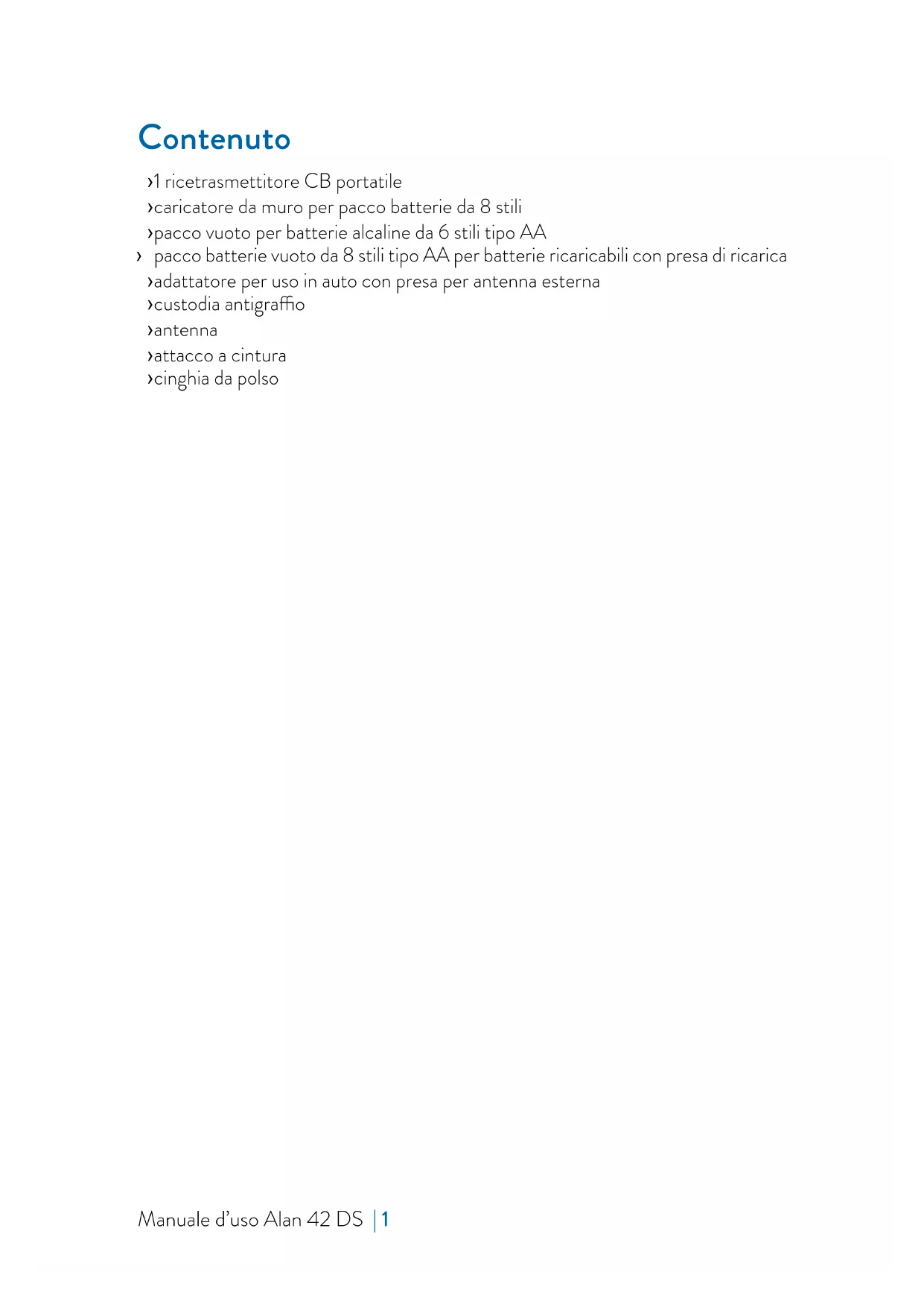 UP /QUICK DOWN) Nota: se il canale non cambia, controllare che non sia stato premuto il tasto EMG o LOCK. In tal caso premere di nuovo il tasto EMG o LOCK per disattivare la funzione d’emergenza. Per le altre funzioni fare riferimento alle istruzioni precedentemente descritte. Per trasmettere: premere e mantenere premuto il tasto PTT situato sul lato sinistro dell’apparato. Parlare verso il microfono con normale tono di voce . Per ricevere: rilasciare semplicemente il tasto PTT. ATTENZIONE: NON ESPORRE IL DISPLAY A TEMPERATURE TROPPO ALTE O TROPPO BASSE. Ricarica delle batterie La ricarica delle batterie può avvenire solo utilizzando il pacco batterie per stili ricaricabili. Non cercate di ricaricare batterie alcaline o non ricaricabili; accertatevi che nel pacco batterie dell’apparecchio, con il caricabatterie collegato, vi siano esclusivamente batterie ricaricabili del tipo consigliato. Inserite la spina del cavo di ricarica in una presa di alimentazione di rete CA e l’altra estremità nella presa della radio. Al termine della carica, scollegate la spina del cavo di ricarica dalla presa da alimentazione di rete CA. Per ottenere la capacità massima ricordiamo che normalmente è necessario, al primo utilizzo della radio, ripetere due/tre volte il ciclo completo di scarica/carica delle batterie. Attenzione: ! L’adattatore da muro in dotazione utilizza il metodo di ricarica standard. La corren- te di ricarica utilizzata è quindi circa il 10% della capacità. Quando le batterie sono completamente cariche, il processo di carica non si blocca automaticamente. ! E’ consigliato non tenere l’apparecchio perennemente connesso al caricatore; se non necessario, staccare il ricetrasmettitore dal caricabatteria non appena é tra- scorso il tempo necessario di ricarica. ! Il caricatore è stato progettato per caricare esclusivamente batterie ricaricabili NiMh e non può essere utilizzato per caricare batterie Alcaline o altre batterie non ricaricabili. Batterie non idonee potrebbero perdere liquido, esplodere, bruciare e causare danni o lesioni personali! ! Per la ricarica, utilizzate il caricatore in dotazione. L’utilizzo di un caricabatterie non originale può causare danni al vostro apparecchio o causare esplosioni e lesioni personali. ! Smaltite le batterie esclusivamente seguendo le normative locali. ! La presa di rete deve rimanere prontamente utilizzabile.8 | Manuale d’uso Alan 42 DS Manuale d’uso Alan 42 DS | 9 Caratteristiche tecniche Canali...................................................................................40 FM (vedi tabella bande) Gamma di frequenza* ............................................................26.565 - 27.99125 MHz Modulazione ............................................................................... F3E (FM), A3E (AM) Impedenza antenna .............................................................................................50 ohm Altoparlante .................................................................................................8 ohm 0.5W Microfono ................................................................................................a condensatore Alimentazione ................................................ min 7.2Vcc;max 13,8Vcc; nom 12,6Vcc Dimensioni .............................................................................................30x70x140 mm Peso ........................................................................................... 220 gr. (senza batterie) RICEVITORE Sensibilità 10dB S/N.........................................................0.5µV (AM), 0.25µV (FM) Selettività ........................................................................................... maggiore di 60 dB Gamma squelch ......................................................................................0.25V-500µV Potenza d’uscita audio ................................................ 0.5W 8 ohm (10% distorsione) Distorsione con un’ingresso di 1000µV....................................................................3% Risposta in frequenza ............................................................................ 400-2400 Hz Frequenze intermedie ............................................................................I° 10.695 MHz ........................................................................................................................ II° 455 KHz Reiezione alle risposte spurie ........................................................... maggiore di 60 dB Corrente assorbita in standby ............100 mA quando é disinserita la funzione save ...................................................................... 45 mA quando é inserita la funzione save TRASMETTITORE Potenza d’uscita ..............................................................duty cycle 10% 4W AM/FM Tolleranza di frequenza ...................................................................................... 0.005% Soppressione emissioni armoniche ................................................. maggiore di 70 dB Corrente assorbita .............................................................................................900 mA Modulazione .........................................................................................AM 90% (± 5%) ................................................................................................................ FM dev. 2.0KHz