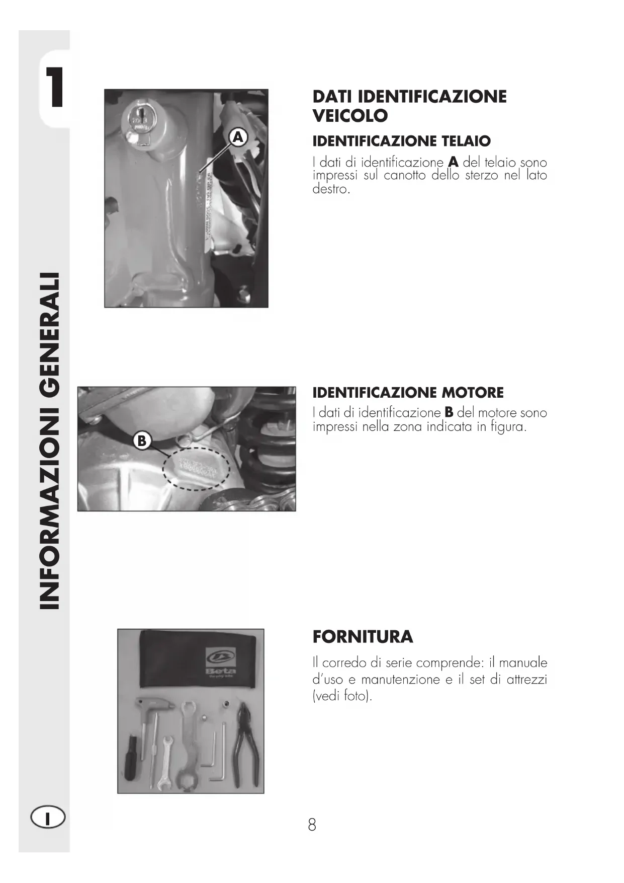 DATI IDENTIFICAZIONE VEICOLO IDENTIFICAZIONE TELAIO I dati di identificazione A del telaio sono impressi sul canotto dello sterzo nel lato destro. IDENTIFICAZIONE MOTORE I dati di identificazione B del motore sono impressi nella zona indicata in figura. FORNITURA Il corredo di serie comprende: il manuale d’uso e manutenzione e il set di attrezzi (vedi foto).