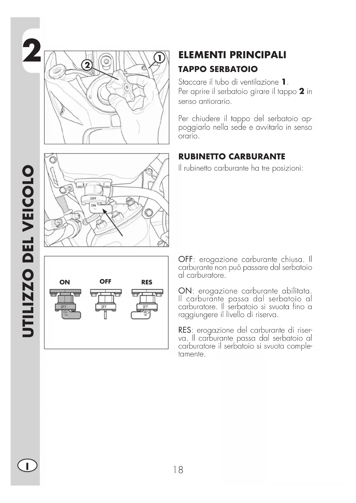 ELEMENTI PRINCIPALI TAPPO SERBATOIO Staccare il tubo di ventilazione 1. Per aprire il serbatoio girare il tappo 2 in senso antiorario. Per chiudere il tappo del serbatoio ap- poggiarlo nella sede e avvitarlo in senso orario. RUBINETTO CARBURANTE Il rubinetto carburante ha tre posizioni: OFF: erogazione carburante chiusa. Il carburante non può passare dal serbatoio al carburatore. ON: erogazione carburante abilitata. Il carburante passa dal serbatoio al carburatore. Il serbatoio si svuota fino a raggiungere il livello di riserva. RES: erogazione del carburante di riser- va. Il carburante passa dal serbatoio al carburatore il serbatoio si svuota comple- tamente.