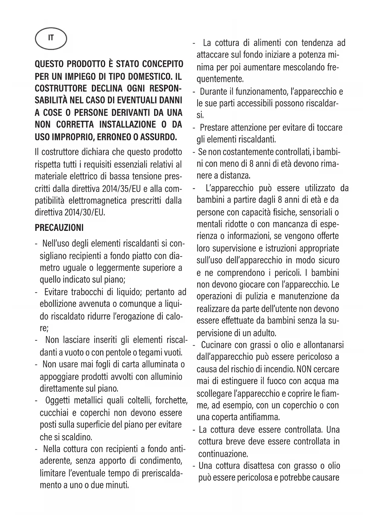 USO IMPROPRIO, ERRONEO O ASSURDO. Il costruttore dichiara che questo prodotto rispetta tutti i requisiti essenziali relativi al materiale elettrico di bassa tensione pres- critti dalla direttiva 2014/35/EU e alla com- patibilità elettromagnetica prescritti dalla direttiva 2014/30/EU. PRECAUZIONI - Nell’uso degli elementi riscaldanti si con- sigliano recipienti a fondo piatto con dia- metro uguale o leggermente superiore a quello indicato sul piano; - Evitare trabocchi di liquido; pertanto ad ebollizione avvenuta o comunque a liqui- do riscaldato ridurre l’erogazione di calo- re; - Non lasciare inseriti gli elementi riscal- danti a vuoto o con pentole o tegami vuoti. - Non usare mai fogli di carta alluminata o appoggiare prodotti avvolti con alluminio direttamente sul piano. - Oggetti metallici quali coltelli, forchette, cucchiai e coperchi non devono essere posti sulla superficie del piano per evitare che si scaldino. - Nella cottura con recipienti a fondo anti- aderente, senza apporto di condimento, limitare l’eventuale tempo di preriscalda- mento a uno o due minuti. - La cottura di alimenti con tendenza ad attaccare sul fondo iniziare a potenza mi- nima per poi aumentare mescolando fre- quentemente. - Durante il funzionamento, l’apparecchio e le sue parti accessibili possono riscaldar- si. - Prestare attenzione per evitare di toccare gli elementi riscaldanti. - Se non costantemente controllati, i bambi- ni con meno di 8 anni di età devono rima- nere a distanza. - L’apparecchio può essere utilizzato da bambini a partire dagli 8 anni di età e da persone con capacità fisiche, sensoriali o mentali ridotte o con mancanza di espe- rienza o informazioni, se vengono oerte loro supervisione e istruzioni appropriate sull’uso dell’apparecchio in modo sicuro e ne comprendono i pericoli. I bambini non devono giocare con l’apparecchio. Le operazioni di pulizia e manutenzione da realizzare da parte dell’utente non devono essere eettuate da bambini senza la su- pervisione di un adulto. - Cucinare con grassi o olio e allontanarsi dall’apparecchio può essere pericoloso a causa del rischio di incendio. NON cercare mai di estinguere il fuoco con acqua ma scollegare l’apparecchio e coprire le fiam- me, ad esempio, con un coperchio o con una coperta antifiamma. - La cottura deve essere controllata. Una cottura breve deve essere controllata in continuazione. - Una cottura disattesa con grasso o olio può essere pericolosa e potrebbe causare ITun incendio. - Pericolo di incendio: non lasciare oggetti sulle superfici di cottura. - Per il piano cottura, utilizzare solo coperchi progettati dal costruttore dell’apparecchio o da questi indicati come adeguati nelle istruzioni per l’uso oppure i coperchi già integrati nell’apparecchio. L’uso di coper- chi inadeguati per il piano cottura può provocare incidenti. Inserire nel cablaggio fisso un mezzo per la disconnessione dalla rete elettrica con una separazione in tutti i poli che preveda la dis- connessione completa in caso di categoria di sovratensione III, come da normativa sul cablaggio. La presa o l’interruttore onnipo- lare devono essere facilmente raggiungibili con l’apparecchiatura installata. La presente apparecchiatura non è predis- posta per essere usata con un temporizza- tore esterno o un sistema separato di con- trollo a distanza. N.B.: - Il costruttore declina ogni responsa- bilità nel caso che quanto sopra e le usuali norme antiinfortunistiche non vengano ris- pettate. Se il cavo di alimentazione è danneggiato, esso deve essere sostituito dal costruttore o dal suo servizio assistenza tecnica o co- munque da una persona con qualifica simi- lare, in modo da prevenire ogni rischio. Istruzioni per l’utente Installazione Tutte le operazioni relative all’installazione (allacciamento elettri- co) devono essere eseguite da personale qualificato secondo le norme vigenti. Per le istruzioni specifiche vedi la parte riservata all’installatore. Uso