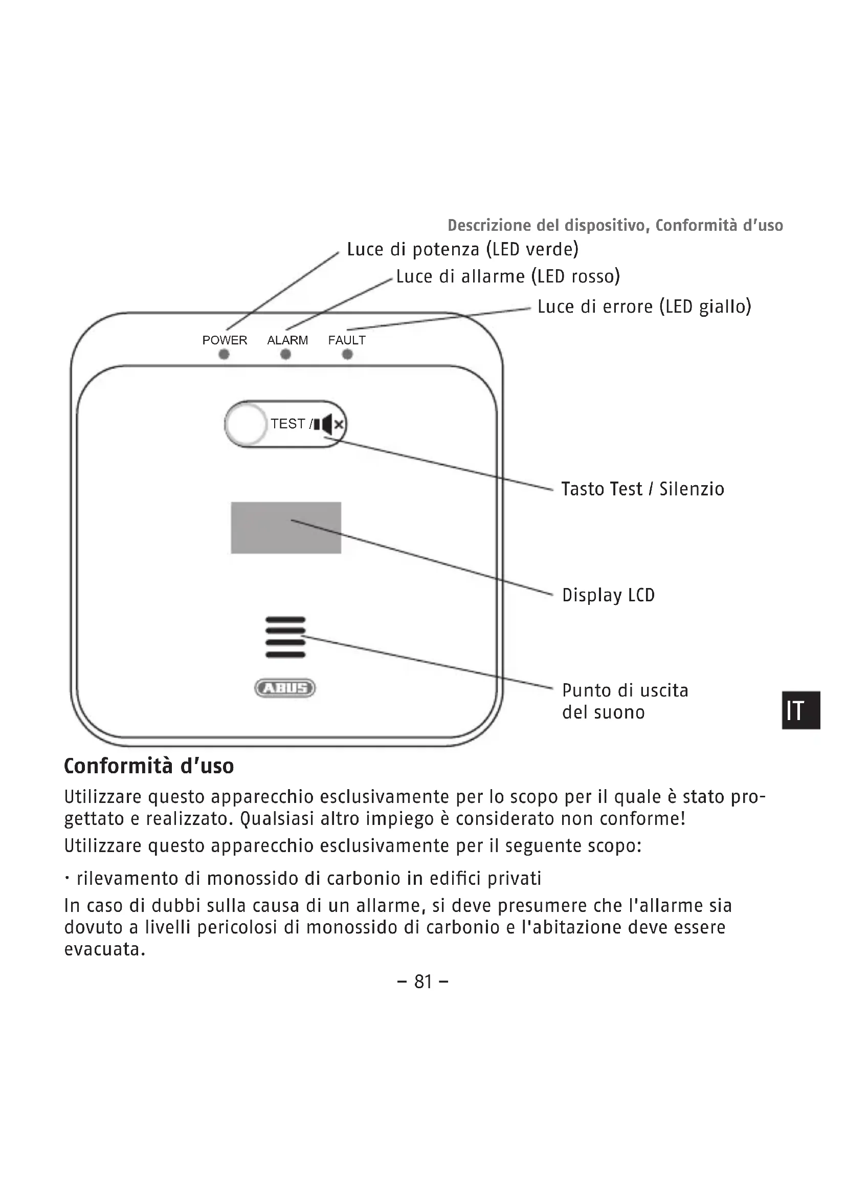 - Il rilevatore di monossido di carbonio ABUS COWM510 è stato progettato e omologato in base alla norma EN 50291 esclusivamente per il rilevamento di CO (monossido di carbonio) all'interno di edici privati!