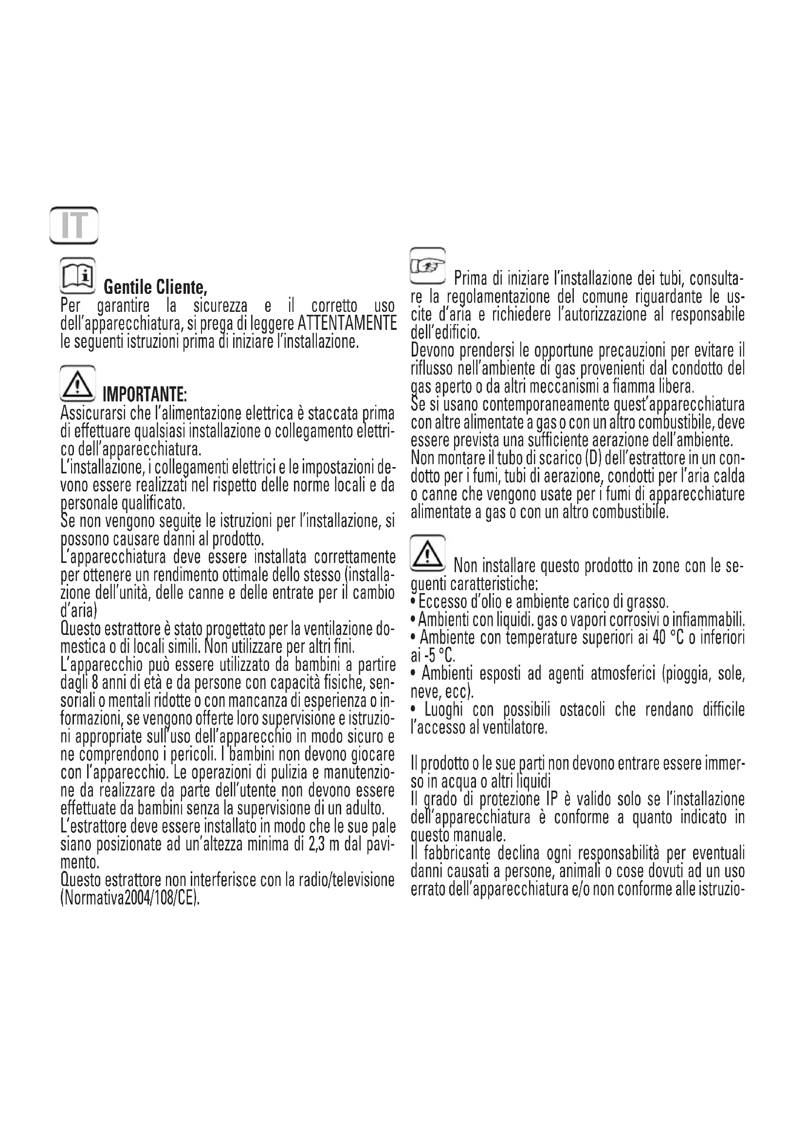 - Luoghi con possibili ostacoli che rendano difficile l’accesso al ventilatore. Il prodotto o le sue parti non devono entrare essere immer- so in acqua o altri liquidi Il grado di protezione IP è valido solo se l’installazione dell’apparecchiatura è conforme a quanto indicato in questo manuale. Il fabbricante declina ogni responsabilità per eventuali danni causati a persone, animali o cose dovuti ad un uso errato dell’apparecchiatura e/o non conforme alle istruzio- Gentile Cliente, Per garantire la sicurezza e il corretto uso dell’apparecchiatura, si prega di leggere ATTENTAMENTE le seguenti istruzioni prima di iniziare l’installazione. IMPORTANTE: Assicurarsi che l’alimentazione elettrica è staccata prima di effettuare qualsiasi installazione o collegamento elettri- co dell’apparecchiatura. L’installazione, i collegamenti elettrici e le impostazioni de- vono essere realizzati nel rispetto delle norme locali e da personale qualificato. Se non vengono seguite le istruzioni per l’installazione, si possono causare danni al prodotto. L’apparecchiatura deve essere installata correttamente per ottenere un rendimento ottimale dello stesso (installa- zione dell’unità, delle canne e delle entrate per il cambio d’aria) Questo estrattore è stato progettato per la ventilazione do- mestica o di locali simili. Non utilizzare per altri fini. L’apparecchio può essere utilizzato da bambini a partire dagli 8 anni di età e da persone con capacità fisiche, sen- soriali o mentali ridotte o con mancanza di esperienza o in- formazioni, se vengono offerte loro supervisione e istruzio- ni appropriate sull’uso dell’apparecchio in modo sicuro e ne comprendono i pericoli. I bambini non devono giocare con l’apparecchio. Le operazioni di pulizia e manutenzio- ne da realizzare da parte dell’utente non devono essere effettuate da bambini senza la supervisione di un adulto. L’estrattore deve essere installato in modo che le sue pale siano posizionate ad un’altezza minima di 2,3 m dal pavi- mento. Questo estrattore non interferisce con la radio/televisione (Normativa2004/108/CE). ITni riguardanti l’installazione, l’uso e la manutenzione con- tenute nel presente manuale. Una volta conclusa l’installazione, queste istruzio- ni dovranno essere consegnate al proprietario/utente dell’apparecchiatura. È necessario consentire lo scollegamento dell’apparecchio dalla rete elettrica dopo l’installazione. Lo scollegamento può essere effettuato facendo in modo che la spina sia accessibile o inserendo un interruttore nell’impianto elettrico fisso che rispetti le normative sulle installazioni elettriche. INSTALLAZIONE: Prima di effettuare l’installazione, verificare che l’elica non sia deformata o danneg- giata, che giri liberamente e che non sia presente nessun corpo estraneo all’interno della struttura. L’installazione dell’apparecchiatura verrà realizzata così come indicato nella docu- mentazione grafica allegata. Si può installare su una parete o sul tetto, con scarico diretto o con condotto di scarico individuale (vedere fig. 1A) Per procedere all’installazione, praticare un’apertura circolare, di diametro corrispon- dente al modello che desidera installare (100 mm; 120 mm o 150 mm), nella parete o soffitto su cui si desidera montare l’apparecchiatura, e praticare anche i fori necessari per il suo fissaggio (vedere fig. 2). Rimuovere la copertura come mostrato nella fig. 1B. Passare i cavi dell’alimentazione elettrica attraverso il pezzo “PC” e il canale abilitato nell’apparecchiatura (vedere fig. 3A). Collegare a seconda dell’apparecchiatura “CO- LLEGAMENTO ELETTRICO” Se il montaggio avvia con un tubo di scarico individuale, collocare il tubo (D) nel foro realizzato per lo scarico dell’aria. Sia nel montaggio con tubo di scarico individuale che in quello con uscita diretta, si devono installare le griglie dell’aria che rispettino i requisiti legali della normativa del paese per impedire l’accesso all’elica del ventilatore (vedere fig. 1A) Assicurarsi che il passaggio dell’aria non venga ostacolato. Fissare la base della carcassa con i tasselli e le viti forniti dal fabbricante. COLLEGAMENTO ELETTRICO: Assicurarsi che la tensione (V) e la frequenza (Hz) dell’alimentazione elettrica alla quale ci si collega coincidano con quelle indicate sulla targhetta delle caratteristiche. L’apparecchiatura deve essere collegata in maniera permanente con i cavi per l’installazione fissa, incassata nella parete, e i cavi devono entrare nell’apparecchiatura dalla parte posteriore. (Cavo con 2 o 3 conduttore rigido o con punta rigida, la sezione minima di 1 mm