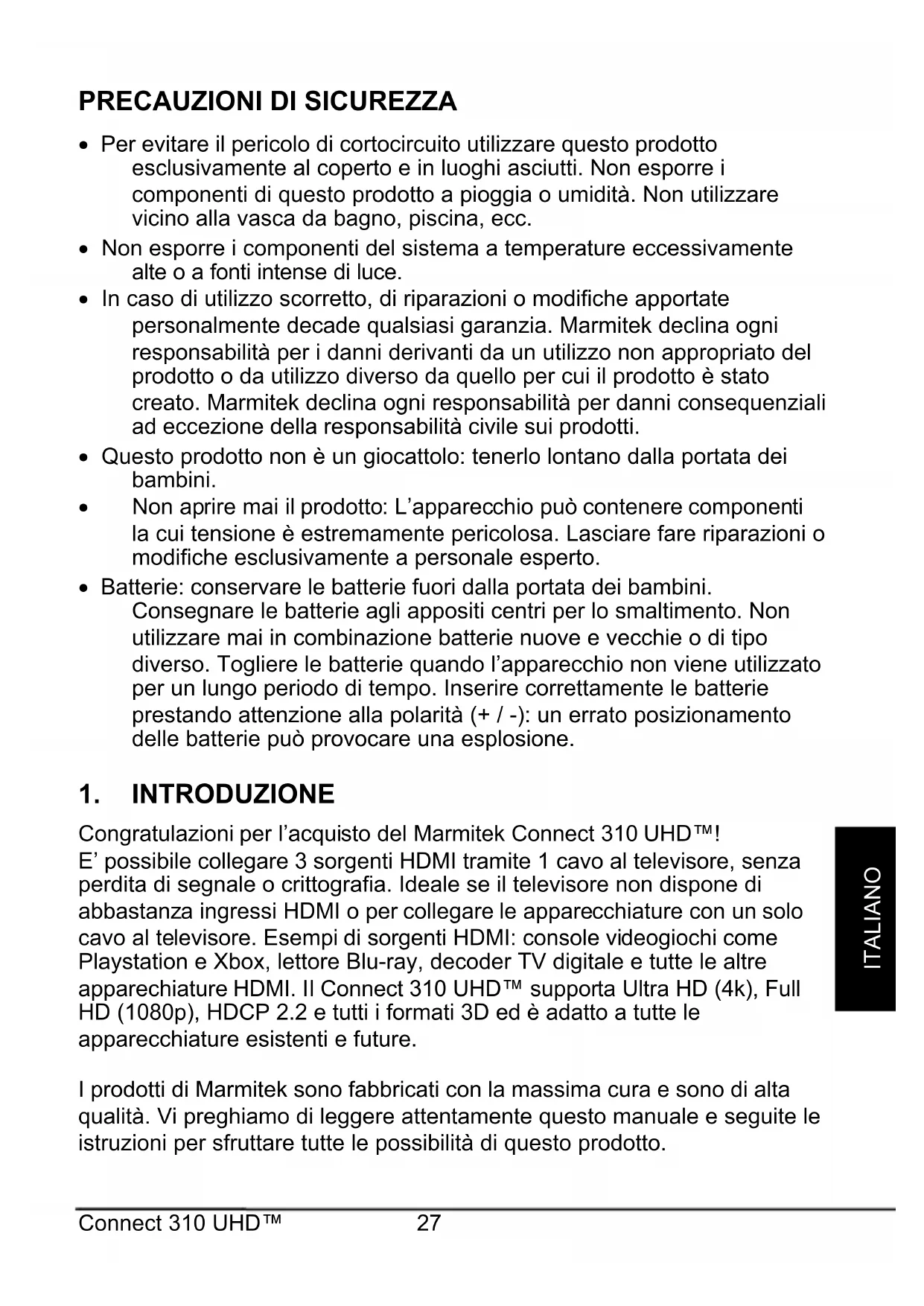Congratulazioni per l’acquisto del Marmitek Connect 310 UHD™! E’ possibile collegare 3 sorgenti HDMI tramite 1 cavo al televisore, senza perdita di segnale o crittografia. Ideale se il televisore non dispone di abbastanza ingressi HDMI o per collegare le apparecchiature con un solo cavo al televisore. Esempi di sorgenti HDMI: console videogiochi come Playstation e Xbox, lettore Blu-ray, decoder TV digitale e tutte le altre apparechiature HDMI. Il Connect 310 UHD™ supporta Ultra HD (4k), Full HD (1080p), HDCP 2.2 e tutti i formati 3D ed è adatto a tutte le apparecchiature esistenti e future. I prodotti di Marmitek sono fabbricati con la massima cura e sono di alta qualità. Vi preghiamo di leggere attentamente questo manuale e seguite le istruzioni per sfruttare tutte le possibilità di questo prodotto.28 © MARMITEK