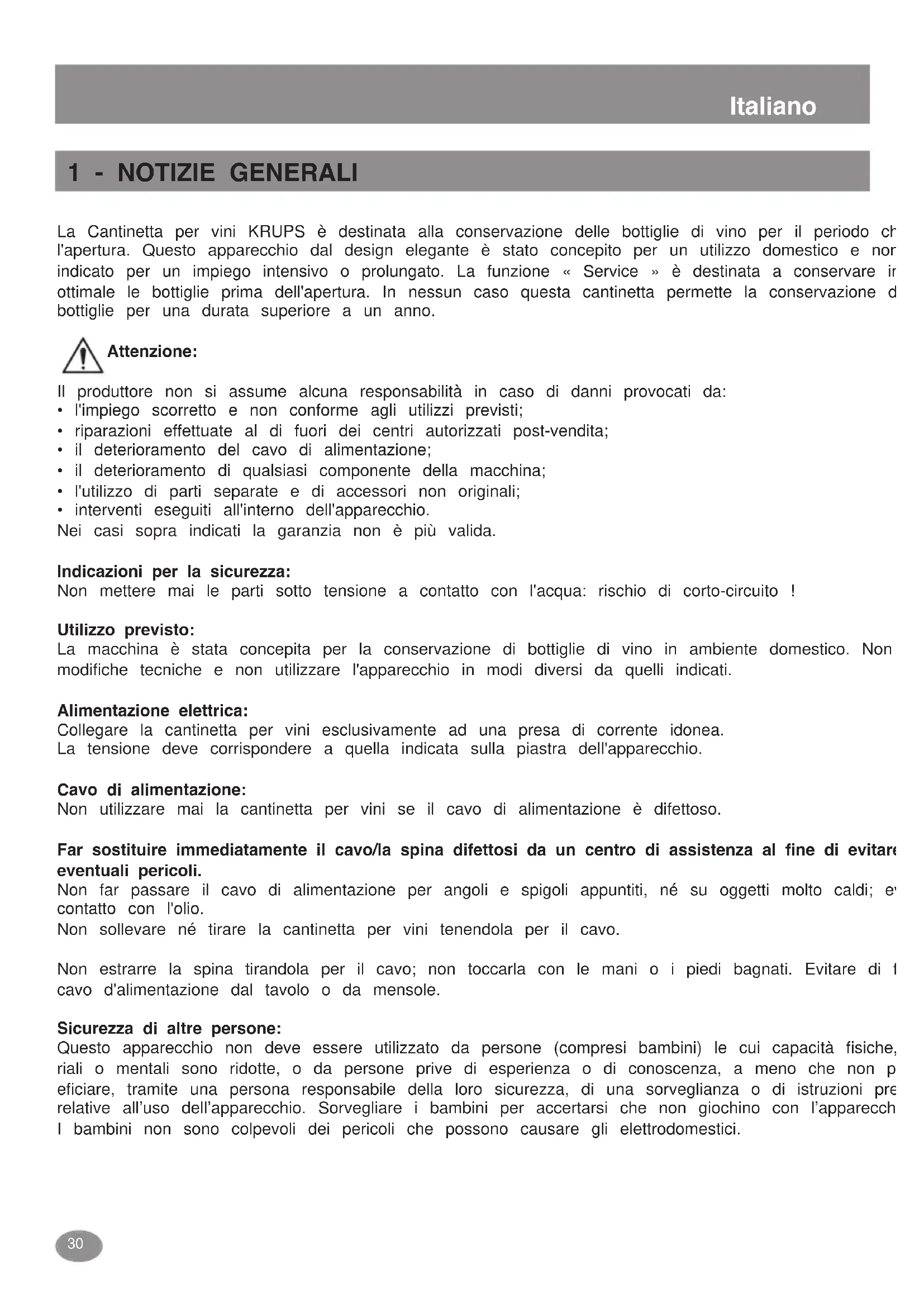 - An beiden Seiten des Geräts muss ein Mindestabstand von 10 bis 15 cm eingehalten werden. Cavea?vins.qxd:KM8005franc$ais-copie.qxd20/02/0915:43Page29Italiano La Cantinetta per vini KRUPS è destinata alla conservazione delle bottiglie di vino per il periodo che precede l'apertura. Questo apparecchio dal design elegante è stato concepito per un utilizzo domestico e non è indicato per un impiego intensivo o prolungato. La funzione « Service » è destinata a conservare in maniera ottimale le bottiglie prima dell'apertura. In nessun caso questa cantinetta permette la conservazione di bottiglie per una durata superiore a un anno. Attenzione: Il produttore non si assume alcuna responsabilità in caso di danni provocati da: