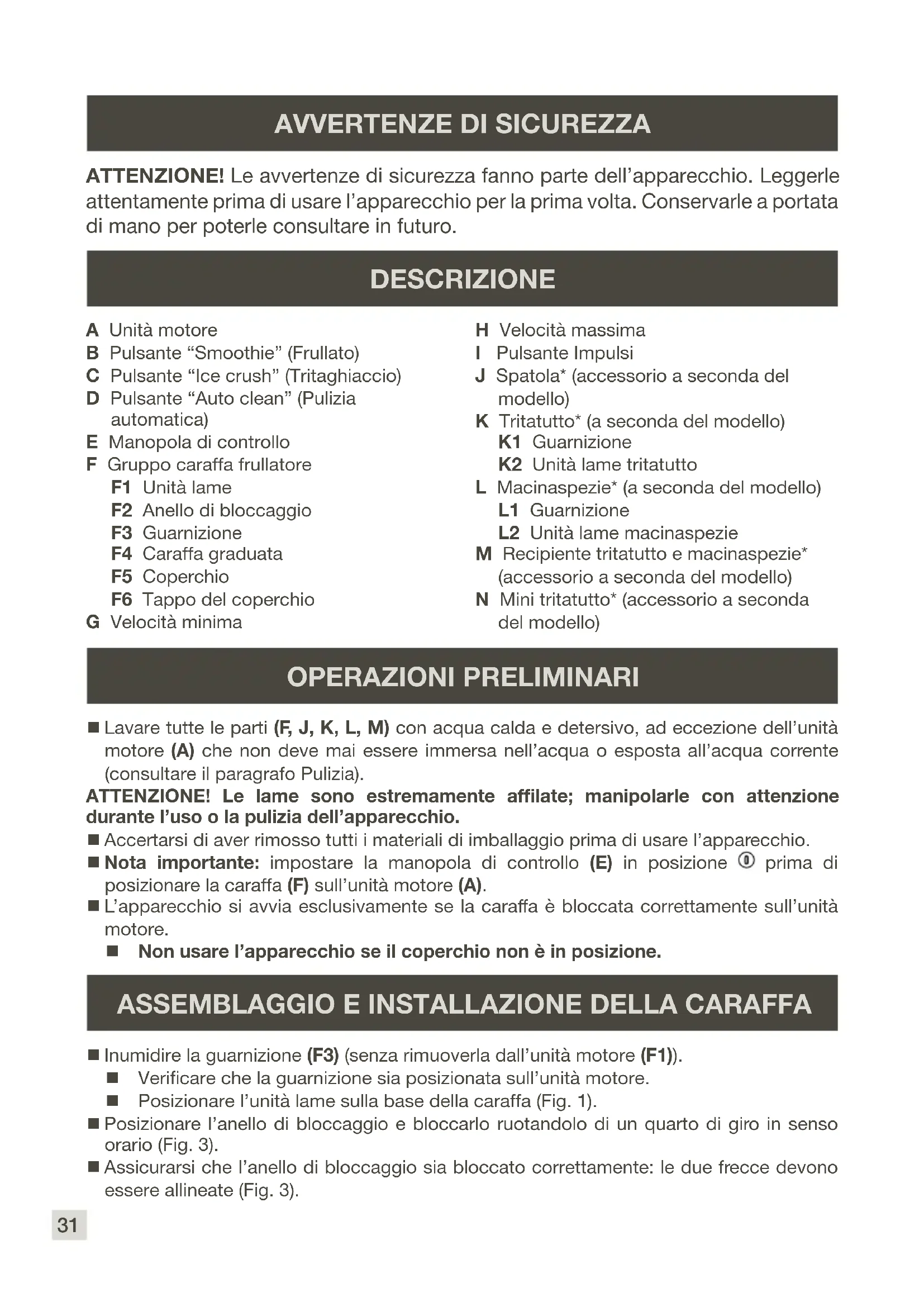 OPERAZIONI PRELIMINARI Lavare tutte le parti (F, J, K, L, M) con acqua calda e detersivo, ad eccezione dell’unità motore (A) che non deve mai essere immersa nell’acqua o esposta all’acqua corrente (consultare il paragrafo Pulizia). ATTENZIONE! Le lame sono estremamente affilate; manipolarle con attenzione durante l’uso o la pulizia dell’apparecchio. Accertarsi di aver rimosso tutti i materiali di imballaggio prima di usare l’apparecchio. Nota importante: impostare la manopola di controllo (E) in posizione prima di posizionare la caraffa (F) sull’unità motore (A). L’apparecchio si avvia esclusivamente se la caraffa è bloccata correttamente sull’unità motore. Non usare l’apparecchio se il coperchio non è in posizione. DESCRIZIONE A Unità motore B Pulsante “Smoothie” (Frullato) C Pulsante “Ice crush” (Tritaghiaccio) D Pulsante “Auto clean” (Pulizia automatica) E Manopola di controllo F Gruppo caraffa frullatore F1 Unità lame F2 Anello di bloccaggio F3 Guarnizione F4 Caraffa graduata F5 Coperchio F6 Tappo del coperchio G Velocità minima H Velocità massima I Pulsante Impulsi J Spatola* (accessorio a seconda del modello) K Tritatutto* (a seconda del modello) K1 Guarnizione K2 Unità lame tritatutto L Macinaspezie* (a seconda del modello) L1 Guarnizione L2 Unità lame macinaspezie M Recipiente tritatutto e macinaspezie* (accessorio a seconda del modello) N Mini tritatutto* (accessorio a seconda del modello)