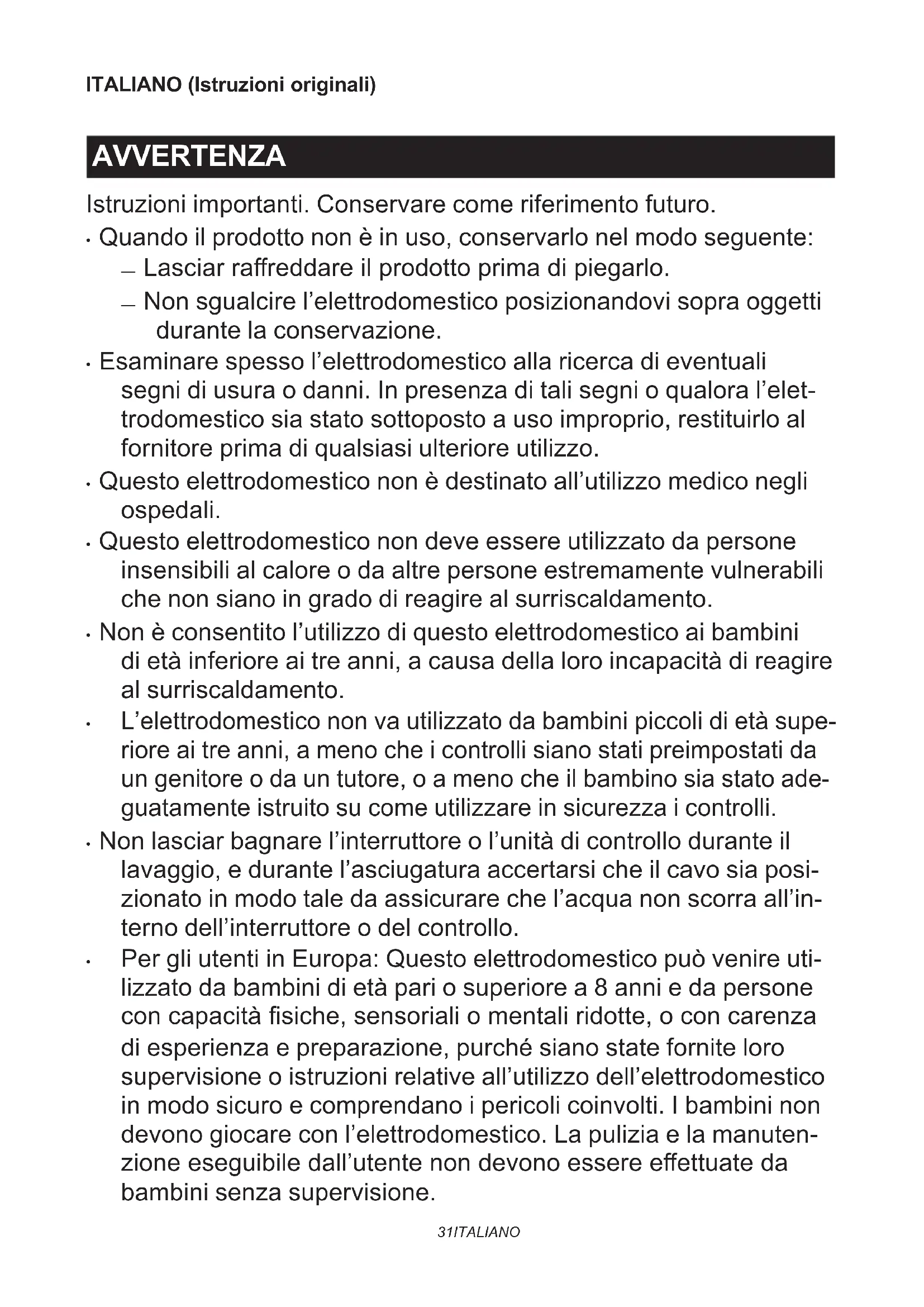 - Questo elettrodomestico non deve essere utilizzato da persone insensibili al calore o da altre persone estremamente vulnerabili che non siano in grado di reagire al surriscaldamento.