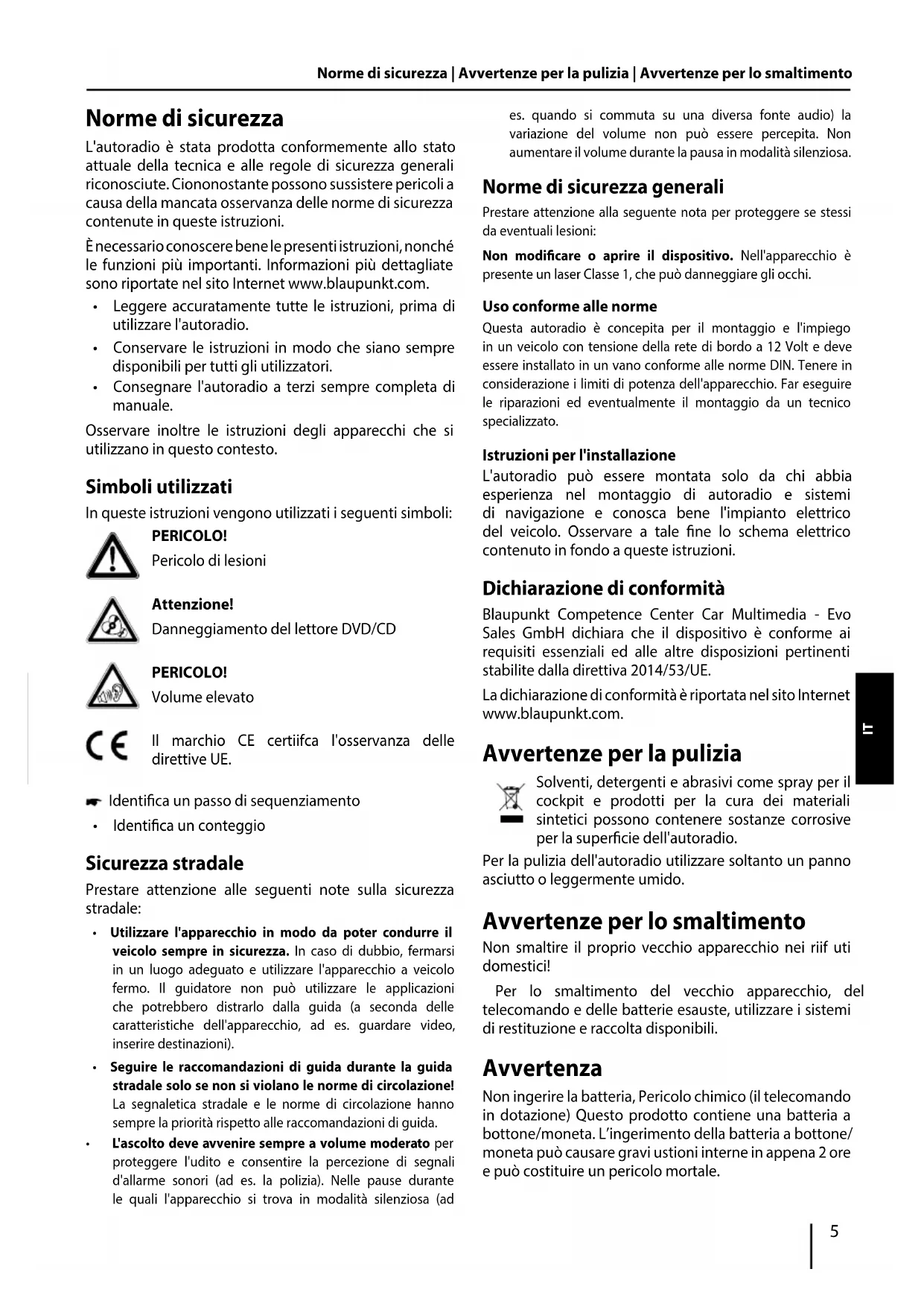 - L'ascolto deve avvenire sempre a volume moderato per proteggere l'udito e consentire la percezione di segnali d'allarme sonori (ad es. la polizia). Nelle pause durante le quali l'apparecchio si trova in modalità silenziosa (ad es. quando si commuta su una diversa fonte audio) la variazione del volume non può essere percepita. Non aumentare il volume durante la pausa in modalità silenziosa. Norme di sicurezza generali Prestare attenzione alla seguente nota per proteggere se stessi da eventuali lesioni:Non modicare o aprire il dispositivo. Nell'apparecchio è presente un laser Classe 1, che può danneggiare gli occhi. Uso conforme alle norme Questa autoradio è concepita per il montaggio e l'impiego in un veicolo con tensione della rete di bordo a 12 Volt e deve essere installato in un vano conforme alle norme DIN. Tenere in considerazione i limiti di potenza dell'apparecchio. Far eseguire le riparazioni ed eventualmente il montaggio da un tecnico specializzato. Istruzioni per l'installazione L'autoradio può essere montata solo da chi abbia esperienza nel montaggio di autoradio e sistemi di navigazione e conosca bene l'impianto elettrico del veicolo. Osservare a tale ne lo schema elettrico contenuto in fondo a queste istruzioni. Dichiarazione di conformità Blaupunkt Competence Center Car Multimedia - Evo Sales GmbH dichiara che il dispositivo è conforme ai requisiti essenziali ed alle altre disposizioni pertinenti stabilite dalla direttiva 2014/53/UE. La dichiarazione di conformità è riportata nel sito Internet www.blaupunkt.com. Avvertenze per la pulizia Solventi, detergenti e abrasivi come spray per il cockpit e prodotti per la cura dei materiali sintetici possono contenere sostanze corrosive per la supercie dell'autoradio. Per la pulizia dell'autoradio utilizzare soltanto un panno asciutto o leggermente umido. Avvertenze per lo smaltimento Non smaltire il proprio vecchio apparecchio nei riif uti domestici! Per lo smaltimento del vecchio apparecchio, del telecomando e delle batterie esauste, utilizzare i sistemi di restituzione e raccolta disponibili. Avvertenza Non ingerire la batteria, Pericolo chimico (il telecomando in dotazione) Questo prodotto contiene una batteria a bottone/moneta. L’ingerimento della batteria a bottone/ moneta può causare gravi ustioni interne in appena 2 ore e può costituire un pericolo mortale. IT6 Tenere le batterie nuove e usate fuori dalla portata dei bambini. Se il vano batterie non si chiude in modo sicuro, non utilizzare più il prodotto e tenerlo fuori dalla portata dei bambini. Se si teme che le batterie siano state ingerite o siano penetrate all'interno del corpo, consultare immediatamente un medico. Contenuto della confezione La confezione contiene: