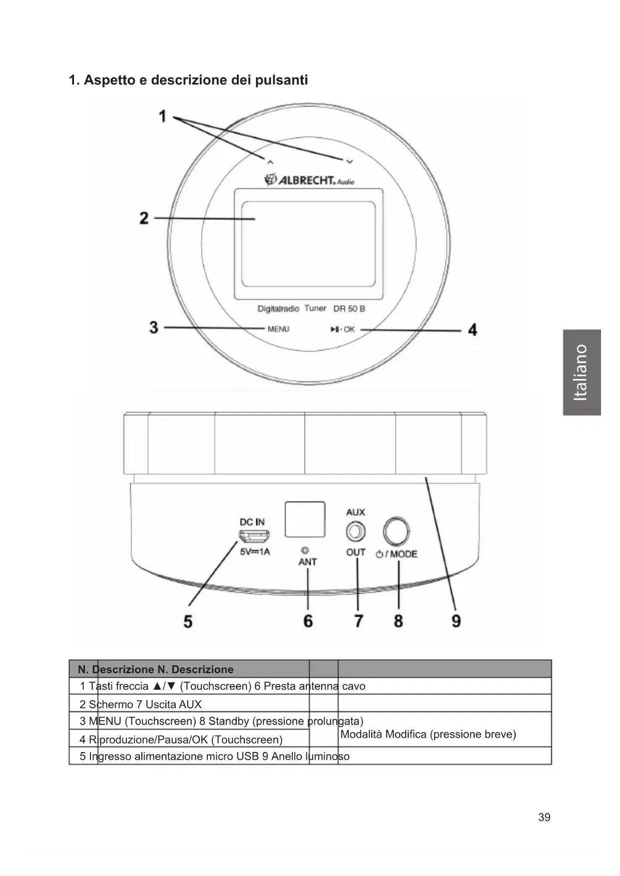 N. Descrizione N. Descrizione 1 Tasti freccia ▲/▼ (Touchscreen) 6 Presta antenna cavo 2 Schermo 7 Uscita AUX 3 MENU (Touchscreen) 8 Standby (pressione prolungata) Modalità Modica (pressione breve) 4 Riproduzione/Pausa/OK (Touchscreen) 5 Ingresso alimentazione micro USB 9 Anello luminoso40 Italiano 1.1. Telecomando Tasto Funzione Accensione/spegnimento (Standby) MODE Modalità modica: DAB+/FM/Bluetooth Aprire l'elenco dei preferiti/salvare i preferiti Impostazioni radiosveglia Silenziamento Control pad ▲/▼ Navigazione tra i menu Modicare il volume
