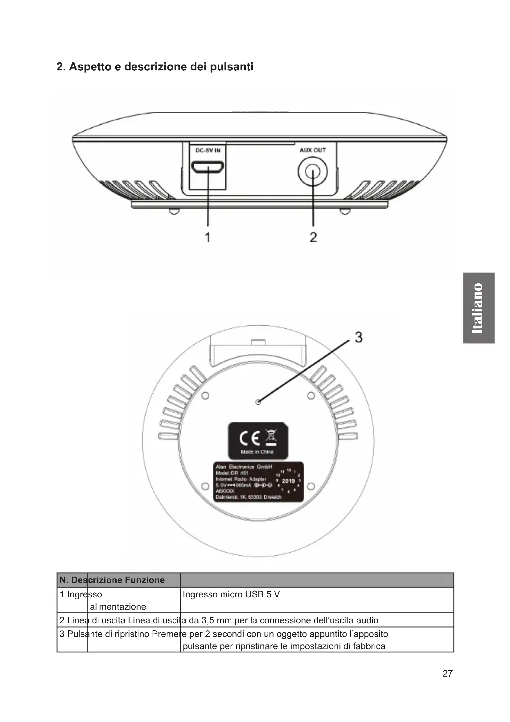 N. Descrizione Funzione 1 Ingresso alimentazione Ingresso micro USB 5 V 2 Linea di uscita Linea di uscita da 3,5 mm per la connessione dell’uscita audio 3 Pulsante di ripristino Premere per 2 secondi con un oggetto appuntito l’apposito pulsante per ripristinare le impostazioni di fabbrica28 Italiano