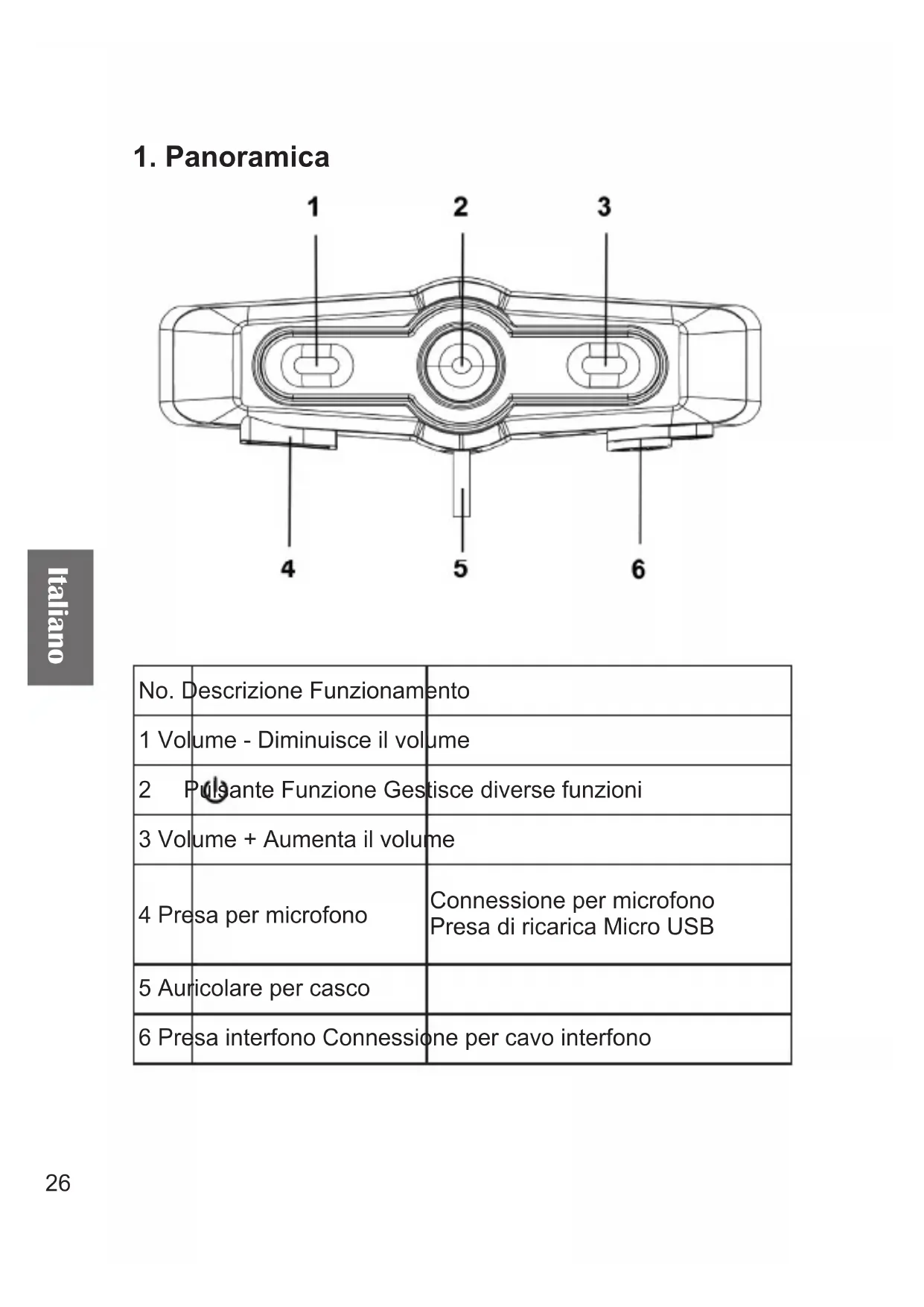 No. Descrizione Funzionamento 1 Volume - Diminuisce il volume 2 Pulsante Funzione Gestisce diverse funzioni 3 Volume + Aumenta il volume 4 Presa per microfono Connessione per microfono Presa di ricarica Micro USB 5 Auricolare per casco 6 Presa interfono Connessione per cavo interfono Pulsante Funzione27 Italiano 1.1. Contenuto della fornitura Assicurarsi che il contenuto seguente sia incluso nella confezione: