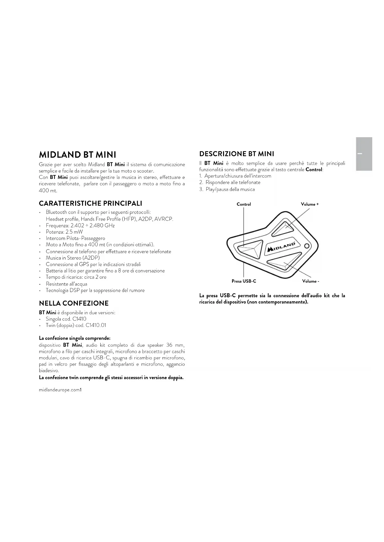 Grazie per aver scelto Midland BT Mini il sistema di comunicazione semplice e facile da installare per la tua moto o scooter. Con BT Mini puoi ascoltare/gestire la musica in stereo, eettuare e ricevere telefonate, parlare con il passeggero o moto a moto fino a 400 mt. CARATTERISTICHE PRINCIPALI