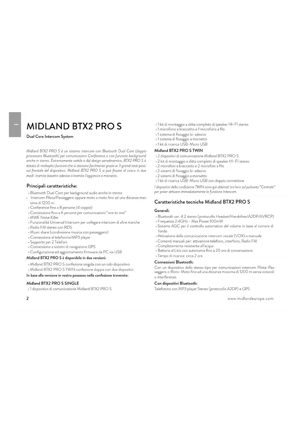 Dual Core Intercom System Midland BTX2 PRO S è un sistema intercom con Bluetooth Dual Core (doppio processore Bluetooth) per comunicazioni Conference e con funzione background anche in stereo. Estremamente sottile e dal design aerodinamico, BTX2 PRO S è dotato di molteplici funzioni che si attivano facilmente grazie ai 3 grandi tasti posti sul frontale del dispositivo. Midland BTX2 PRO S si può fissare al casco in due modi: tramite basetta adesiva o tramite l’aggancio a morsetto. Principali caratteristiche: › Bluetooth Dual Core per background audio anche in stereo › Intercom Pilota/Passeggero oppure moto a moto fino ad una distanza mas- sima di 1200 m. › Conference fino a 8 persone (4 coppie) › Connessione fino a 6 persone per comunicazioni “one to one” › MWE Noise Killer › Funzionalità Universal Intercom per collegare intercom di altre marche › Radio FM stereo con RDS › Music share (condivisione musica con passeggero) › Connessione al telefonino/MP3 player › Supporto per 2 Telefoni › Connessione a sistemi di navigazione GPS › Configurazione ed aggiornamento firmware da PC via USB Midland BTX2 PRO S è disponibile in due versioni: › Midland BTX2 PRO S confezione singola con un solo dispositivo › Midland BTX2 PRO S TWIN confezione doppia con due dispositivi In base alla versione in vostro possesso nella confezione troverete: Midland BTX2 PRO S SINGLE › 1 dispositivo di comunicazione Midland BTX2 PRO S › 1 kit di montaggio a slitta completo di speaker HI-FI stereo › 1 microfono a braccetto e 1 microfono a filo › 1 sistema di fissaggio bi-adesivo › 1 sistema di fissaggio a morsetto › 1 kit di ricarica USB-Micro USB Midland BTX2 PRO S TWIN › 2 dispositivi di comunicazione Midland BTX2 PRO S › 2 kit di montaggio a slitta completo di speaker HI-FI stereo › 2 microfoni a braccetto e 2 microfoni a filo › 2 sistemi di fissaggio bi-adesivo › 2 sistemi di fissaggio a morsetto › 1 kit di ricarica USB-Micro USB con doppio connettore I dispositivi della confezione TWIN sono già abbinati tra loro sul pulsante “Centrale” per poter attivare immediatamente la funzione Intercom. Caratteristiche tecniche Midland BTX2 PRO S Generali: › Bluetooth ver. 4.2 stereo (protocollo Headset/Handsfree/A2DP/AVRCP) › Frequenza 2.4GHz - Max Power 100mW › Sistema AGC per il controllo automatico del volume in base al rumore di fondo › Attivazione della comunicazione intercom vocale (VOX) o manuale › Comandi manuali per: attivazione telefono, interfono, Radio FM › Completamente resistente all’acqua › Batteria al Litio con autonomia fino a 20 ore di conversazione › Tempo di ricarica: circa 2 ore Connessioni Bluetooth: Con un dispositivo dello stesso tipo per comunicazioni intercom Pilota-Pas- seggero o Moto-Moto fino ad una distanza massima di 1200 m senza ostacoli o interferenze. Con dispositivi Bluetooth: Telefonino con MP3 player Stereo (protocollo A2DP) e GPSI www.midlandeurope.com 3 Ricarica delle batterie Assicuratevi che il dispositivo di comunicazione sia completamente carico pri- ma di iniziare ad utilizzarlo. La prima volta sono necessarie almeno 3 ore. Suc- cessivamente il tempo si riduce mediamente a 2 ore per una ricarica completa. Per ragioni di comodità, il dispositivo può essere rimosso dal casco per essere ricaricato. Per caricare il dispositivo di comunicazione, sollevate la protezione in gomma della presa di ricarica e collegate ad essa lo spinotto del caricatore, quindi innestate la spina CA del caricatore ad una presa di rete elettrica. Il LED rosso lampeggerà per tutto il tempo della ricarica. Lasciate l’apparec- chio collegato fino a che il LED rosso si spegne e il LED blu rimane acceso fisso. Quando la carica è completa, (LED rosso non più lampeggiante) scollegate il dispositivo dal caricatore. Attenzione: Midland BTX2 PRO S è stato progettato per essere resistente alla pioggia. Verificate sempre che il gommino di protezione della presa di ricarica sia ben chiuso in caso di pioggia. Attenzione: ogni volta che viene inserito (o disinserito) il plug di ricarica, il dispo- sitivo si spegne (per utilizzarlo mentre è in carica è necessario quindi riaccenderlo con il plug inserito). Descrizione dispositivo e sistema di fissaggio Descrizione Midland BTX2 PRO S Il dispositivo Midland BTX2 PRO S è dotato di 5 pulsanti, tutti nella parte frontale. I tre pulsanti principali sono pulsanti multifunzione: pulsante “Avanti” (a sini- stra), pulsante “Centrale” e pulsante “Indietro” (a destra). I due pulsanti più piccoli, in alto a destra, sono invece il Volume + ed il volume -. Presa Ricarica: Permette la ricarica del dispositivo tramite alimentatore mi- croUSB standard. Descrizione Kit Audio Il sistema audio comprende due altoparlanti stereo HI-FI e due microfoni in- tercambiabili: uno a braccetto e l’altro a filo. Entrambi hanno un mini connet- tore che vi permette di scegliere il microfono che più si adatta al vostro tipo di casco. LED Centrale Volume - Volume + Avanti Indietro Presa ricaricaI 4 www.midlandeurope.com Altoparlanti stereo I due altoparlanti stereo hanno una fascia adesiva/velcro che facilita il loro fis- saggio all’interno del casco. Raccomandiamo di non tenere il volume troppo alto, in quanto è importante mantenere l’attenzione in mezzo al traco e du- rante i vostri spostamenti in moto. Microfono Il microfono può essere fissato al casco in due modi, in base alla tipologia di microfono scelta. Microfono a braccetto Posizionate il braccetto del microfono con il velcro/ adesivo tra l’imbottitura e la parte rigida del casco, in modo che il microfono e il simbolo bianco sul mi- crofono siano posizionati correttamente di fronte alla bocca. Questa soluzione è adatta per caschi modulari. Per i caschi aperti (Jet) è disponibile anche un microfono specifico opzionale (cod. C1253). Microfono a filo Posizionate il microfono, grazie al velcro/adesivo, all’interno del casco di fronte alla b