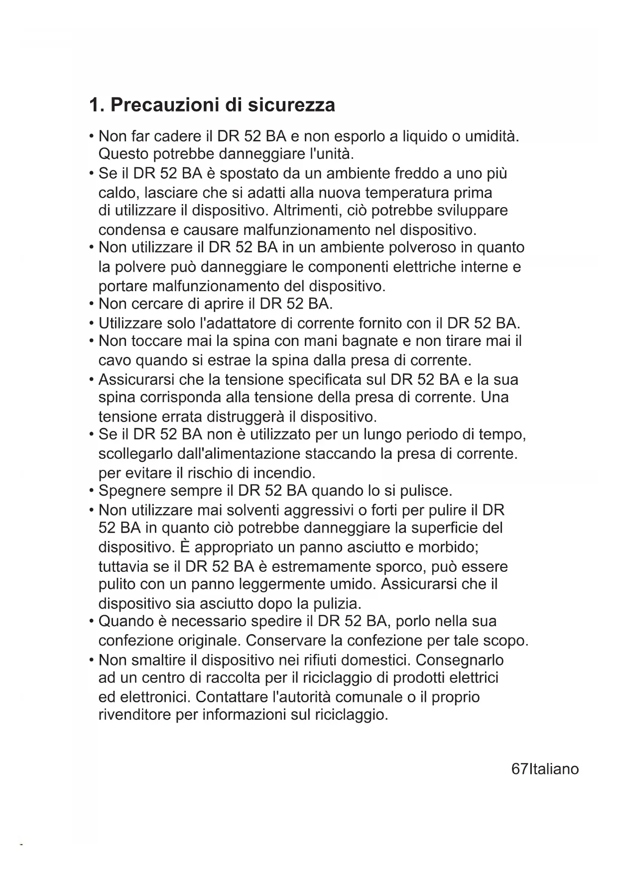 - Non utilizzare mai solventi aggressivi o forti per pulire il DR 52 BA in quanto ciò potrebbe danneggiare la supercie del dispositivo. È appropriato un panno asciutto e morbido; tuttavia se il DR 52 BA è estremamente sporco, può essere pulito con un panno leggermente umido. Assicurarsi che il dispositivo sia asciutto dopo la pulizia.