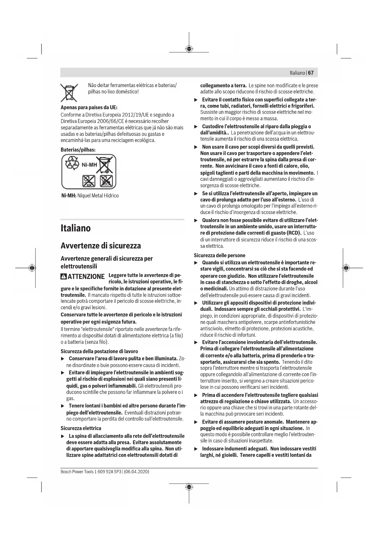 Il livello di vibrazione ed il valore di emissione acustica indi- cati nelle presenti istruzioni sono stati rilevati conformemen- te ad una procedura di misurazione unificata e sono utilizza- bili per confrontare gli elettroutensili. Le stesse procedure sono idonee anche per una valutazione temporanea del livel- lo di vibrazione e dell’emissione acustica. Il livello di vibrazione ed il valore di emissione acustica sono riferiti agli impieghi principali dell’elettroutensile; qualora, tuttavia, l’elettroutensile venisse utilizzato per altre applica- zioni, oppure con accessori differenti o in caso di insufficien- te manutenzione, il livello di vibrazione ed il valore di emis- sione acustica potrebbero variare. Ciò potrebbe aumentare sensibilmente l’emissione di vibrazioni e l’emissione acustica sull’intero periodo di funzionamento. Per valutare con precisione i valori di vibrazione e di emissio- ne acustica, andranno considerati anche i periodi nei quali l’utensile sia spento, oppure acceso, ma non utilizzato. Ciò potrebbe ridurre sensibilmente l’emissione di vibrazioni e l’emissione acustica sull’intero periodo di funzionamento. Bosch Power Tools 1 609 92A 5P3 | (06.04.2020)74 | Italiano Adottare misure di sicurezza supplementari per proteggere l’operatore dall’effetto delle vibrazioni: ad esempio, sottopo- nendo a manutenzione l’elettroutensile e gli utensili accesso- ri, mantenendo calde le mani e organizzando i vari processi di lavoro. Montaggio Volume di fornitura Gli avvitatori industriali a batteria vengono forniti senza bat- teria, gli avvitatori ad angolo industriali a batteria senza testa angolare e senza batteria. Per la scelta degli accessori adatti rivolgersi al proprio riven- ditore specializzato di utensili industriali Bosch. Ambiente di funzionamento e di magazzinaggio L’elettroutensile è adatto esclusivamente per l’impiego in luoghi chiusi. Per un perfetto funzionamento dell’utensile, la temperatura ambiente consentita deve essere compresa tra –5°C e +50°C (23°F e 122°F), con un’umidità relativa dell’aria consentita compresa tra 20 e 95%, in assenza di condensa. Per evitare danni alle celle, la batteria deve essere conserva- ta ad una temperatura compresa tra 0°C (32°F) e 45°C (113°F). Montaggio della testa angolare BT-ANGLEEXACT 2 | 3 | 6 | 7 | 8 | 15 | 17 | 23 | 30 Per questi avvitatori ad angolo industriali a batteria andrà in- nanzitutto montata una testa angolare (vedi «Dati tecnici», Pagina70) di tipo idoneo. u Accertarsi che il commutatore del senso di rotazione sia posizionato al centro (blocco accensione) oppure che la batteria ricaricabile sia stata tolta dall’elettrou- tensile prima di montare, regolare o smontare una te- sta avvitatrice. Trattenere l’elettroutensile, mediante la chiave fissa (6), sul- la superficie per chiave (5) della flangia della testa angolare. u Non serrare in alcun caso l’elettroutensile sugli involu- cri dell'alloggiamento. Applicare la testa angolare (3) nella posizione desiderata sulla flangia e con la chiave fissa (4) agendo sulla superficie per chiave (16), avvitare saldamente il dado. Durante tale fase, contrastare sulla flangia della testa angola- re con la chiave fissa (6). BT-ANGLEEXACT 23 | 30 Questi avvitatori industriali angolari a batteria sono utilizza- bili esclusivamente con la testa angolare 0607451618. Dispositivo di sospensione La staffa di sospensione (8) consente di fissare l’elettrouten- sile ad un gancio di sospensione. Applicare la staffa di sospensione (8) sull’elettroutensile e farlo innestare negli appositi intagli (14). u Controllare regolarmente lo stato della staffa di so- spensione e dei ganci integrati nel foro per appendere l'utensile. Procedura di ricarica Avvertenza: caricatori e batterie non sono compresi nel ma- teriale fornito in dotazione. La spina di rete illustrata può essere differente da quella sul Vostro elettroutensile. u Accertarsi che caricatore e batteria siano adatti per la rete elettrica specifica del Paese. Caricatore AL 2450 DV (vedere figuraA) Collegare il caricatore (21) con il connettore (22) all’alimen- tazione di rete ed inserire la batteria (18) nella posizione corretta nella sede di ricarica del caricatore. u Non esercitare forza nell’introdurre/estrarre la batte- ria. Le batterie con il contatto ad innesto APT (Akku Pack Top) sono concepite in modo tale che possano essere in- serite nell’elettroutensile o nel caricatore solamente nella posizione corretta. L’indicatore LED verde (23) inizia a lampeggiare. Questo in- dica lo scorrere della corrente di carica. Il processo di ricari- ca si arresta automaticamente quando la batteria è comple- tamente carica. Quando l’indicatore LED verde non lampeg- gia più bensì è illuminato costantemente, significa che l’ope- razione di ricarica è terminata. Un segnale acustico suona per circa 2secondi e segnala la carica completa della batte- ria ricaricabile. L’indicatore LED con luce rossa fissa (24) segnala un pro- cesso di ricarica con corrente di carica ridotta. Se l’indicato- re LED rosso lampeggia, non è possibile alcuna operazione di ricarica. Anomalie - Cause e rimedi Causa Rimedio Gli indicatori LED non si illuminano Il connettore di rete del cari- cabatteria non è inserita (correttamente) Inserire il connettore di rete (completamente) nella presa di corrente Difetto nella presa di corren- te, nel cavo di rete o nel cari- cabatteria Controllare la tensione di re- te e, all’occorrenza, far con- trollare il caricabatteria da un Centro Assistenza Clienti au- torizzato per elettroutensili Bosch Procedura di ricarica non possibile La temperatura della batteria ricaricabile non è nel campo ammissibile Portare la temperatura della batteria - mediante raffred- damento o riscaldamento - nel range di temperatura consentito tra 0°C (32°F) e 45°C (113°F) Contatti della batteria conta- minati Pulire i contatti della batte- ria, ad es. innestando e disin- nest