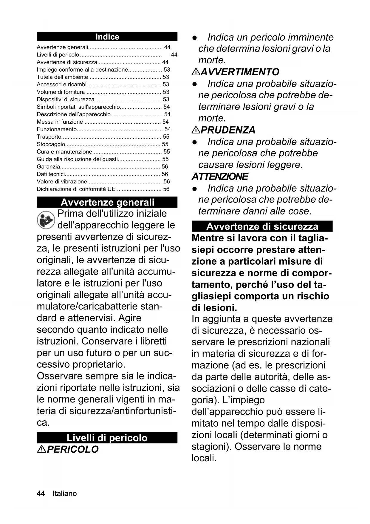 - Avvertenze di sicurezza p. 44