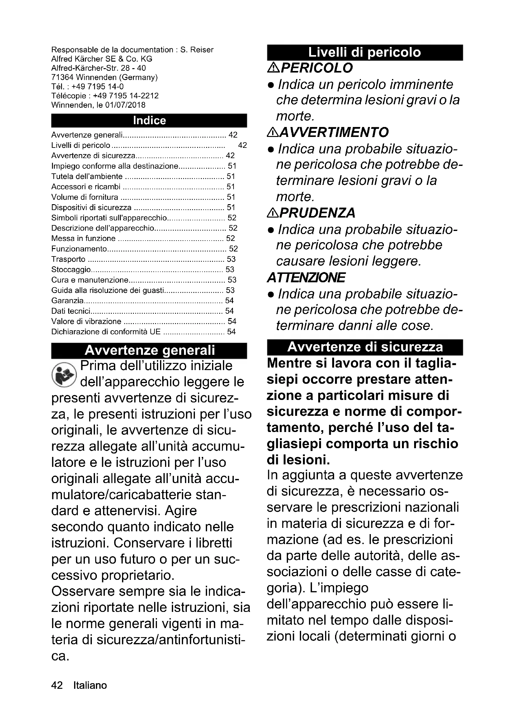 - Longueur de la lame de coupe mm 450 Poids (sans bloc-batterie) kg 2,55 Chairman of the Board of ManagementDirector Regulatory Affairs & Certification H. Jenner S. Reiser42 Italiano Responsable de la documentation : S. Reiser Alfred Kärcher SE & Co. KG Alfred-Kärcher-Str. 28 - 40 71364 Winnenden (Germany) Tél. : +49 7195 14-0 Télécopie : +49 7195 14-2212 Winnenden, le 01/07/2018 Indice Avvertenze generali Prima dell’utilizzo iniziale dell’apparecchio leggere le presenti avvertenze di sicurez- za, le presenti istruzioni per l’uso originali, le avvertenze di sicu- rezza allegate all’unità accumu- latore e le istruzioni per l’uso originali allegate all’unità accu- mulatore/caricabatterie stan- dard e attenervisi. Agire secondo quanto indicato nelle istruzioni. Conservare i libretti per un uso futuro o per un suc- cessivo proprietario. Osservare sempre sia le indica- zioni riportate nelle istruzioni, sia le norme generali vigenti in ma- teria di sicurezza/antinfortunisti- ca. Livelli di pericolo PERICOLO ● Indica un pericolo imminente che determina lesioni gravi o la morte. 몇 AVVERTIMENTO ● Indica una probabile situazio- ne pericolosa che potrebbe de- terminare lesioni gravi o la morte. 몇 PRUDENZA ● Indica una probabile situazio- ne pericolosa che potrebbe causare lesioni leggere. ATTENZIONE ● Indica una probabile situazio- ne pericolosa che potrebbe de- terminare danni alle cose. Avvertenze di sicurezza Mentre si lavora con il taglia- siepi occorre prestare atten- zione a particolari misure di sicurezza e norme di compor- tamento, perché l’uso del ta- gliasiepi comporta un rischio di lesioni. In aggiunta a queste avvertenze di sicurezza, è necessario os- servare le prescrizioni nazionali in materia di sicurezza e di for- mazione (ad es. le prescrizioni da parte delle autorità, delle as- sociazioni o delle casse di cate- goria). L’impiego dell’apparecchio può essere li- mitato nel tempo dalle disposi- zioni locali (determinati giorni o Avvertenze generali p. 42