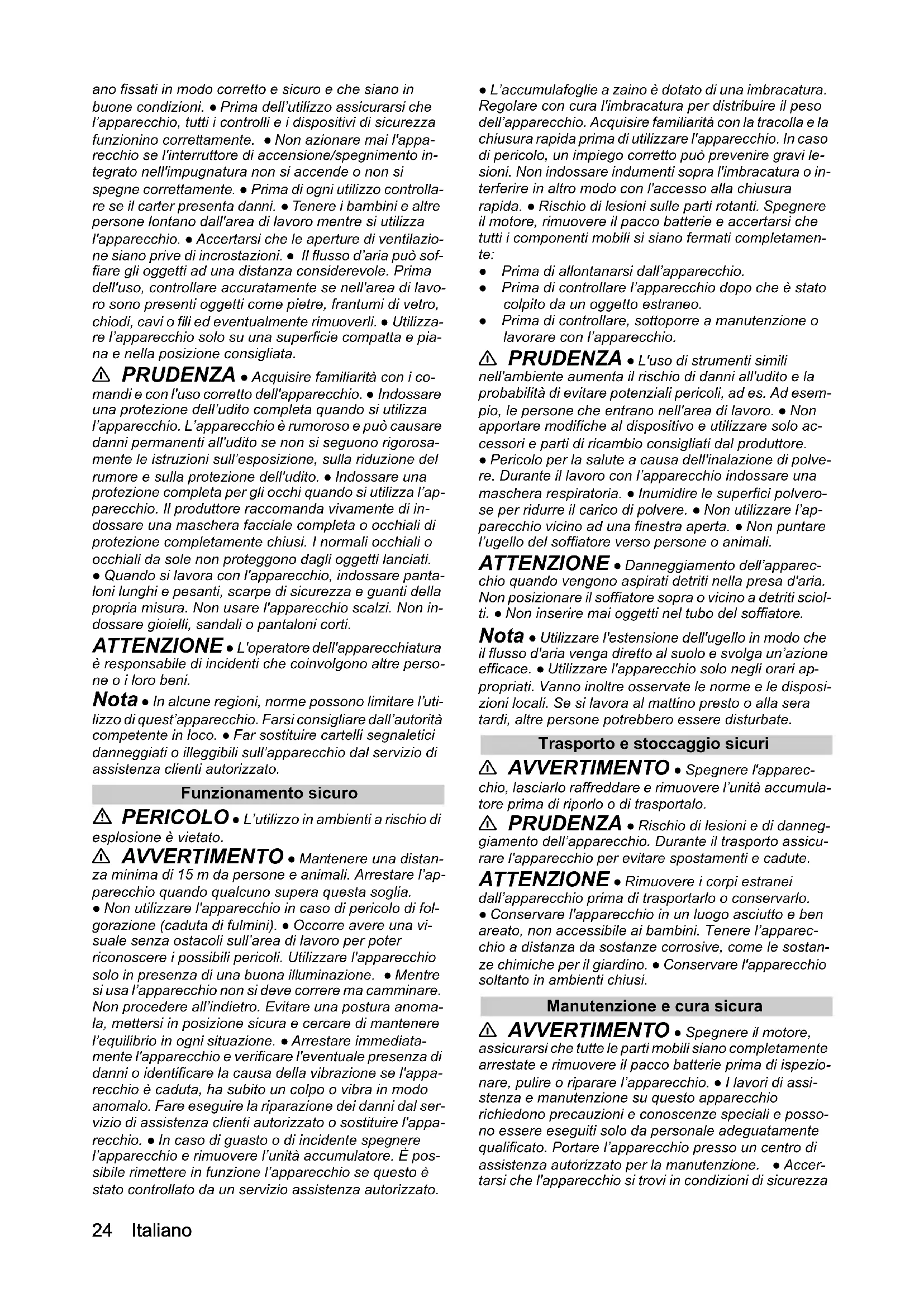 - Dichiarazione di conformità UE Italiano ano fissati in modo corretto e sicuro e che siano in buone condizioni. ● Prima dell’utilizzo assicurarsi che l’apparecchio, tutti i controlli e i dispositivi di sicurezza funzionino correttamente. ● Non azionare mai l'appa- recchio se l'interruttore di accensione/spegnimento in- tegrato nell'impugnatura non si accende o non si spegne correttamente. ● Prima di ogni utilizzo controlla- re se il carter presenta danni. ● Tenere i bambini e altre persone lontano dall'area di lavoro mentre si utilizza l'apparecchio. ● Accertarsi che le aperture di ventilazio- ne siano prive di incrostazioni. ● Il flusso d’aria può sof- fiare gli oggetti ad una distanza considerevole. Prima dell'uso, controllare accuratamente se nell'area di lavo- ro sono presenti oggetti come pietre, frantumi di vetro, chiodi, cavi o fili ed eventualmente rimuoverli. ● Utilizza- re l’apparecchio solo su una superficie compatta e pia- na e nella posizione consigliata. 몇 PRUDENZA ● Acquisire familiarità con i co- mandi e con l'uso corretto dell'apparecchio. ● Indossare una protezione dell’udito completa quando si utilizza l’apparecchio. L’apparecchio è rumoroso e può causare danni permanenti all'udito se non si seguono rigorosa- mente le istruzioni sull’esposizione, sulla riduzione del rumore e sulla protezione dell'udito. ● Indossare una protezione completa per gli occhi quando si utilizza l’ap- parecchio. Il produttore raccomanda vivamente di in- dossare una maschera facciale completa o occhiali di protezione completamente chiusi. I normali occhiali o occhiali da sole non proteggono dagli oggetti lanciati. ● Quando si lavora con l'apparecchio, indossare panta- loni lunghi e pesanti, scarpe di sicurezza e guanti della propria misura. Non usare l'apparecchio scalzi. Non in- dossare gioielli, sandali o pantaloni corti. ATTENZIONE ● L'operatore dell'apparecchiatura è responsabile di incidenti che coinvolgono altre perso- ne o i loro beni. Nota ● In alcune regioni, norme possono limitare l’uti- lizzo di quest’apparecchio. Farsi consigliare dall’autorità competente in loco. ● Far sostituire cartelli segnaletici danneggiati o illeggibili sull’apparecchio dal servizio di assistenza clienti autorizzato. Funzionamento sicuro PERICOLO ● L’utilizzo in ambienti a rischio di esplosione è vietato. 몇 AVVERTIMENTO ● Mantenere una distan- za minima di 15 m da persone e animali. Arrestare l’ap- parecchio quando qualcuno supera questa soglia. ● Non utilizzare l'apparecchio in caso di pericolo di fol- gorazione (caduta di fulmini). ● Occorre avere una vi- suale senza ostacoli sull’area di lavoro per poter riconoscere i possibili pericoli. Utilizzare l'apparecchio solo in presenza di una buona illuminazione. ● Mentre si usa l’apparecchio non si deve correre ma camminare. Non procedere all’indietro. Evitare una postura anoma- la, mettersi in posizione sicura e cercare di mantenere l’equilibrio in ogni situazione. ● Arrestare immediata- mente l'apparecchio e verificare l'eventuale presenza di danni o identificare la causa della vibrazione se l'appa- recchio è caduta, ha subito un colpo o vibra in modo anomalo. Fare eseguire la riparazione dei danni dal ser- vizio di assistenza clienti autorizzato o sostituire l'appa- recchio. ● In caso di guasto o di incidente spegnere l’apparecchio e rimuovere l’unità accumulatore. È pos- sibile rimettere in funzione l’apparecchio se questo è stato controllato da un servizio assistenza autorizzato. ● L’accumulafoglie a zaino è dotato di una imbracatura. Regolare con cura l'imbracatura per distribuire il peso dell’apparecchio. Acquisire familiarità con la tracolla e la chiusura rapida prima di utilizzare l'apparecchio. In caso di pericolo, un impiego corretto può prevenire gravi le- sioni. Non indossare indumenti sopra l'imbracatura o in- terferire in altro modo con l'accesso alla chiusura rapida. ● Rischio di lesioni sulle parti rotanti. Spegnere il motore, rimuovere il pacco batterie e accertarsi che tutti i componenti mobili si siano fermati completamen- te: ● Prima di allontanarsi dall’apparecchio. ● Prima di controllare l’apparecchio dopo che è stato colpito da un oggetto estraneo. ● Prima di controllare, sottoporre a manutenzione o lavorare con l’apparecchio. 몇 PRUDENZA ● L'uso di strumenti simili nell'ambiente aumenta il rischio di danni all'udito e la probabilità di evitare potenziali pericoli, ad es. Ad esem- pio, le persone che entrano nell'area di lavoro. ● Non apportare modifiche al dispositivo e utilizzare solo ac- cessori e parti di ricambio consigliati dal produttore. ● Pericolo per la salute a causa dell'inalazione di polve- re. Durante il lavoro con l’apparecchio indossare una maschera respiratoria. ● Inumidire le superfici polvero- se per ridurre il carico di polvere. ● Non utilizzare l’ap- parecchio vicino ad una finestra aperta. ● Non puntare l’ugello del soffiatore verso persone o animali. ATTENZIONE ● Danneggiamento dell’apparec- chio quando vengono aspirati detriti nella presa d'aria. Non posizionare il soffiatore sopra o vicino a detriti sciol- ti. ● Non inserire mai oggetti nel tubo del soffiatore. Nota ● Utilizzare l'estensione dell'ugello in modo che il flusso d'aria venga diretto al suolo e svolga un’azione efficace. ● Utilizzare l'apparecchio solo negli orari ap- propriati. Vanno inoltre osservate le norme e le disposi- zioni locali. Se si lavora al mattino presto o alla sera tardi, altre persone potrebbero essere disturbate. Trasporto e stoccaggio sicuri 몇 AVVERTIMENTO ● Spegnere l'apparec- chio, lasciarlo raffreddare e rimuovere l’unità accumula- tore prima di riporlo o di trasportalo. 몇 PRUDENZA ● Rischio di lesioni e di danneg- giamento dell’apparecchio. Durante il trasporto assicu- rare l'apparecchio per evitare spostamenti e cadute. ATTENZIONE ● Rimuovere i corpi estrane
