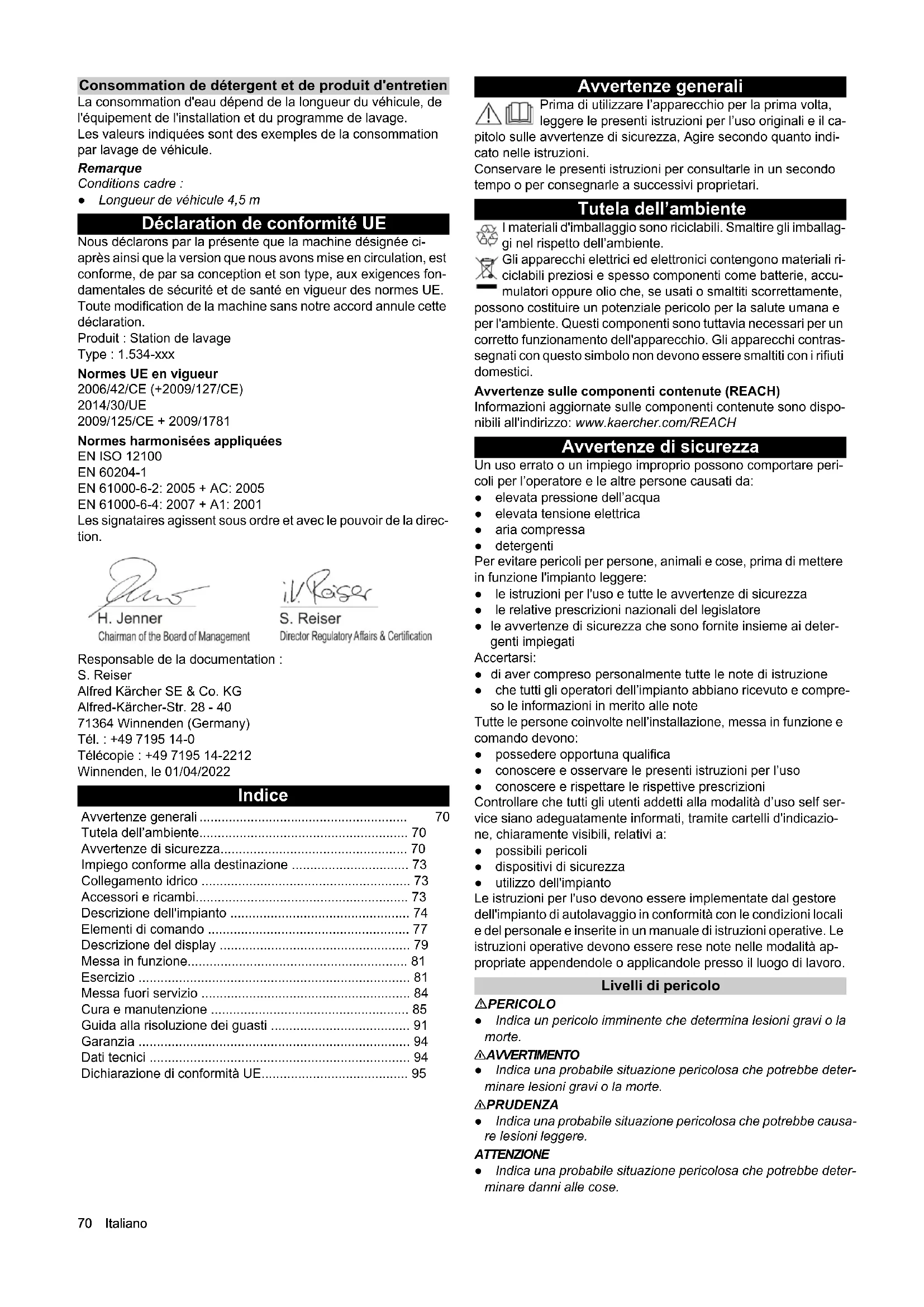 - Caractéristiques techniques Sous réserve de modifications techniques. CW 3 / CW 5 (CWB 3/1) CW 3 / CW 5 (CWB 3/2) CW 3 / CW 5 (CWB 3/3) Dimensions de l'installation Hauteur de lavage mm 2100, 2200, 2300 2400, 2500, 2600 2700, 2800, 2900 Hauteur de cadre mm 2900 3200 3500 Hauteur totale mm 2930, 3030, 3130 3230, 3330, 3430 3530, 3630, 3730 Largeur de cadre mm 3500 3500 3500 Largeur totale balais latéraux mm 4040 4040 4040 Largeur totale protection anti-éclaboussures mm 4060 4060 4060 Profondeur de cadre / profondeur avec brosses rotatives mm 1600 / 2170 1600 / 2170 1600 / 2170 Longueur totale hall court mm 2070 2070 2070 Largeur de l'installation à hauteur de miroir mm 2450 2450 2450 Largeur de l'installation dans la zone du lavage des roues mm 2100 2100 2100 Largeur de voie rails mm 2550, 2700, 2800 2550, 2700, 2800 2550, 2700, 2800 Largeur de hall avec distance de sécurité mm 4500 4500 4500 Dimension limite du véhicule Brosses de lavage Diamètre des brosses côté mm 975 975 975 Vitesse de rotation de la brosse côté 1/min 107 107 107 Diamètre de la brosse toit mm 975 975 975 Vitesse de rotation de la brosse toit 1/min 127 127 127 Vitesse du portique m/min 0 - 24 0 - 24 0 - 24 Raccordement électrique Tension du secteur V 400 400 400 Fréquence Hz 50 50 50 Puissance raccordée kW 10-16 10-16 10-16 Commande max. fusible de puissance A 35-50 35-50 35-50 Raccord d'alimentation en eau Largeur nominale Pouce 1 1 1 Pression d'écoulement selon DIN 1988 (pour 100 l/min) MPa 0,4 - 0,6 0,4 - 0,6 0,4 - 0,6 Température max. °C 50 50 50 Raccord d'air comprimé Largeur nominale Pouce 1/2 1/2 1/2 Pression MPa 0,6 - 0,8 0,6 - 0,8 0,6 - 0,8 Consommation / lavages (sans mise hors gel, en fonction du programme pour une longueur de véhicule de 4,5 m) l505050 Consommation avec une protection antigel, env. l 700 700 700 Valeurs déterminées selon EN 60335-2-79 Niveau sonore en fonctionnement à sec dB(A) 94 94 94 Niveau sonore Module haute pression dB(A) 87 87 8770 Italiano Consommation de détergent et de produit d'entretien La consommation d'eau dépend de la longueur du véhicule, de l'équipement de l'installation et du programme de lavage. Les valeurs indiquées sont des exemples de la consommation par lavage de véhicule. Remarque Conditions cadre : ● Longueur de véhicule 4,5 m Déclaration de conformité UE Nous déclarons par la présente que la machine désignée ci- après ainsi que la version que nous avons mise en circulation, est conforme, de par sa conception et son type, aux exigences fon- damentales de sécurité et de santé en vigueur des normes UE. Toute modification de la machine sans notre accord annule cette déclaration. Produit : Station de lavage Type : 1.534-xxx Normes UE en vigueur 2006/42/CE (+2009/127/CE) 2014/30/UE 2009/125/CE + 2009/1781 Normes harmonisées appliquées EN ISO 12100 EN 60204-1 EN 61000-6-2: 2005 + AC: 2005 EN 61000-6-4: 2007 + A1: 2001 Les signataires agissent sous ordre et avec le pouvoir de la direc- tion. Responsable de la documentation : S. Reiser Alfred Kärcher SE & Co. KG Alfred-Kärcher-Str. 28 - 40 71364 Winnenden (Germany) Tél. : +49 7195 14-0 Télécopie : +49 7195 14-2212 Winnenden, le 01/04/2022 Indice Avvertenze generali Prima di utilizzare l’apparecchio per la prima volta, leggere le presenti istruzioni per l’uso originali e il ca- pitolo sulle avvertenze di sicurezza, Agire secondo quanto indi- cato nelle istruzioni. Conservare le presenti istruzioni per consultarle in un secondo tempo o per consegnarle a successivi proprietari. Tutela dell’ambiente I materiali d'imballaggio sono riciclabili. Smaltire gli imballag- gi nel rispetto dell’ambiente. Gli apparecchi elettrici ed elettronici contengono materiali ri- ciclabili preziosi e spesso componenti come batterie, accu- mulatori oppure olio che, se usati o smaltiti scorrettamente, possono costituire un potenziale pericolo per la salute umana e per l'ambiente. Questi componenti sono tuttavia necessari per un corretto funzionamento dell'apparecchio. Gli apparecchi contras- segnati con questo simbolo non devono essere smaltiti con i rifiuti domestici. Avvertenze sulle componenti contenute (REACH) Informazioni aggiornate sulle componenti contenute sono dispo- nibili all'indirizzo: www.kaercher.com/REACH Avvertenze di sicurezza Un uso errato o un impiego improprio possono comportare peri- coli per l’operatore e le altre persone causati da: ● elevata pressione dell’acqua ● elevata tensione elettrica ● aria compressa ● detergenti Per evitare pericoli per persone, animali e cose, prima di mettere in funzione l'impianto leggere: ● le istruzioni per l'uso e tutte le avvertenze di sicurezza ● le relative prescrizioni nazionali del legislatore ● le avvertenze di sicurezza che sono fornite insieme ai deter- genti impiegati Accertarsi: ● di aver compreso personalmente tutte le note di istruzione ● che tutti gli operatori dell’impianto abbiano ricevuto e compre- so le informazioni in merito alle note Tutte le persone coinvolte nell’installazione, messa in funzione e comando devono: ● possedere opportuna qualifica ● conoscere e osservare le presenti istruzioni per l’uso ● conoscere e rispettare le rispettive prescrizioni Controllare che tutti gli utenti addetti alla modalità d’uso self ser- vice siano adeguatamente informati, tramite cartelli d'indicazio- ne, chiaramente visibili, relativi a: ● possibili pericoli ● dispositivi di sicurezza ● utilizzo dell'impianto Le istruzioni per l'uso devono essere implementate dal gestore dell'impianto di autolavaggio in conformità con le condizioni locali e del personale e inserite in un manuale di istruzioni operative. Le istruzioni operative devono essere rese note nelle modalità ap- propriate appendendole o applicandole presso il luogo di lavoro. Livelli di pericolo PERICOLO ● Indica un pericolo imminente che determina lesioni gravi o la morte. 몇 AVVERTIMENTO ● Indica una probabile situazione 