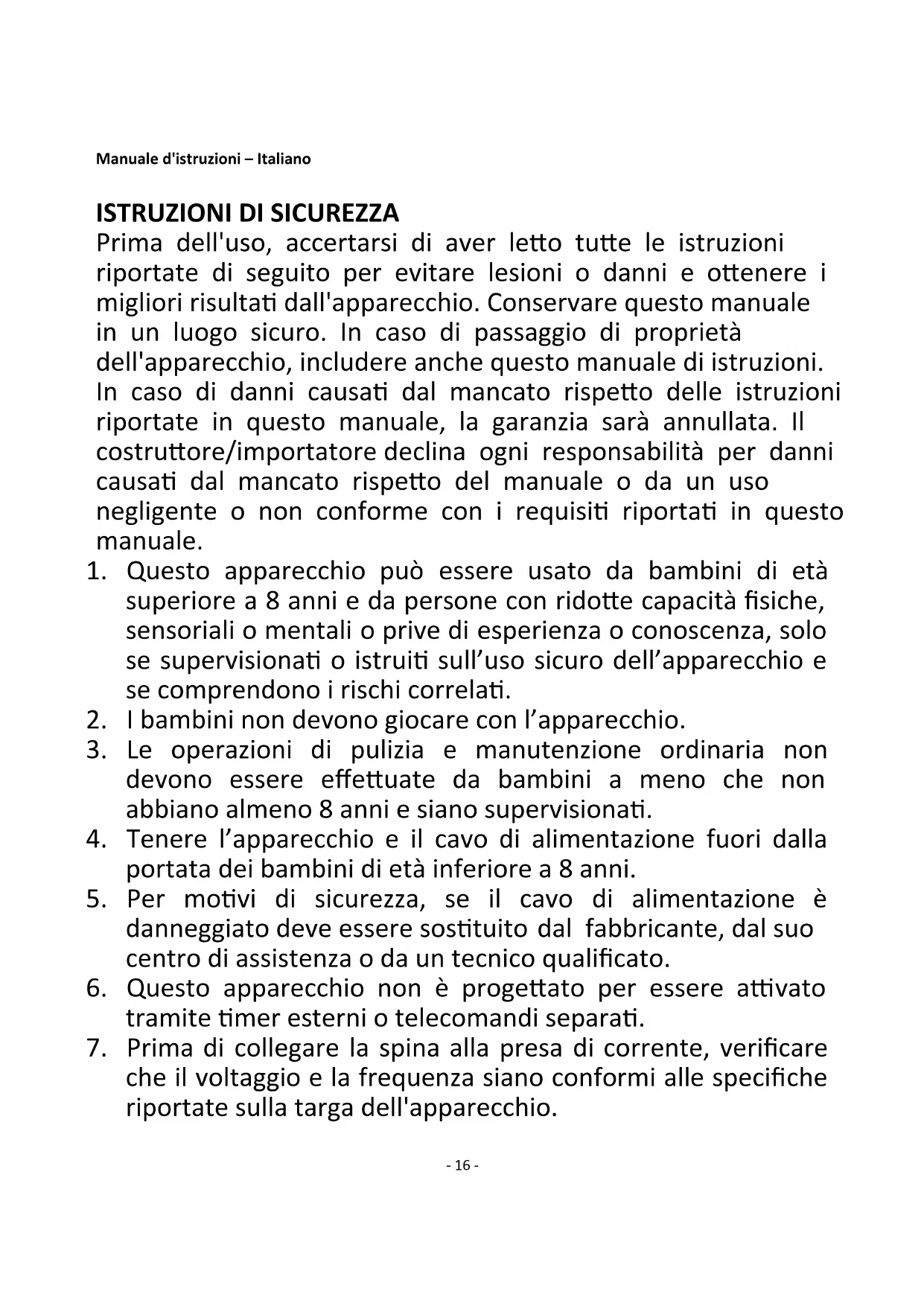 Prima dell'uso, accertarsi di aver letto tutte le istruzioni riportate di seguito per evitare lesioni o danni e ottenere i migliori risultati dall'apparecchio. Conservare questo manuale in un luogo sicuro. In caso di passaggio di proprietà dell'apparecchio, includere anche questo manuale di istruzioni. In caso di danni causati dal mancato rispetto delle istruzioni riportate in questo manuale, la garanzia sarà annullata. Il costruttore/importatore declina ogni responsabilità per danni causati dal mancato rispetto del manuale o da un uso negligente o non conforme con i requisiti riportati in questo manuale.
