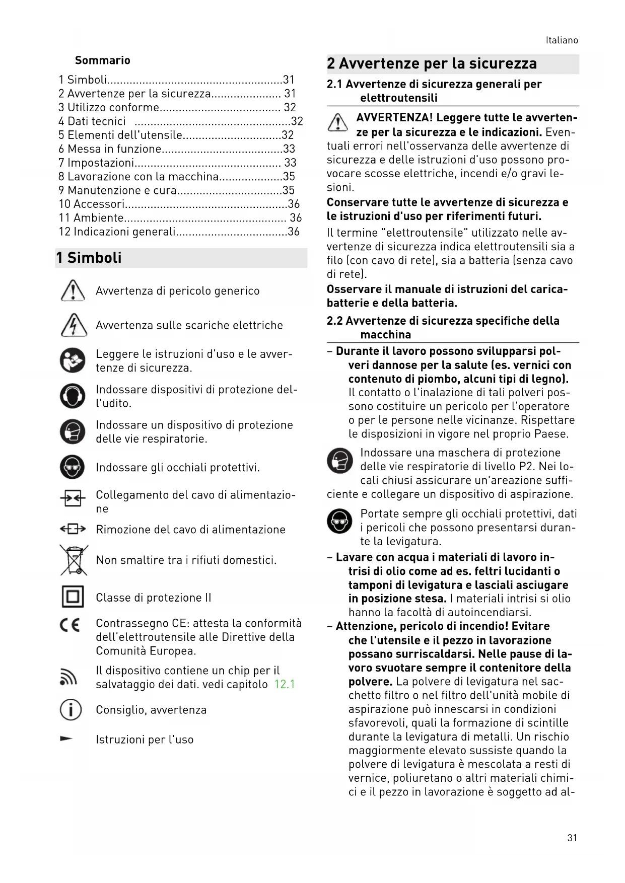 - 12 Indicazioni generali 1 Simboli Avvertenza di pericolo generico Avvertenza sulle scariche elettriche Leggere le istruzioni d'uso e le avver tenze di sicurezza. Indossare dispositivi di protezione del l'udito. Indossare un dispositivo di protezione delle vie respiratorie. Indossare gli occhiali protettivi. Collegamento del cavo di alimentazio p. 36