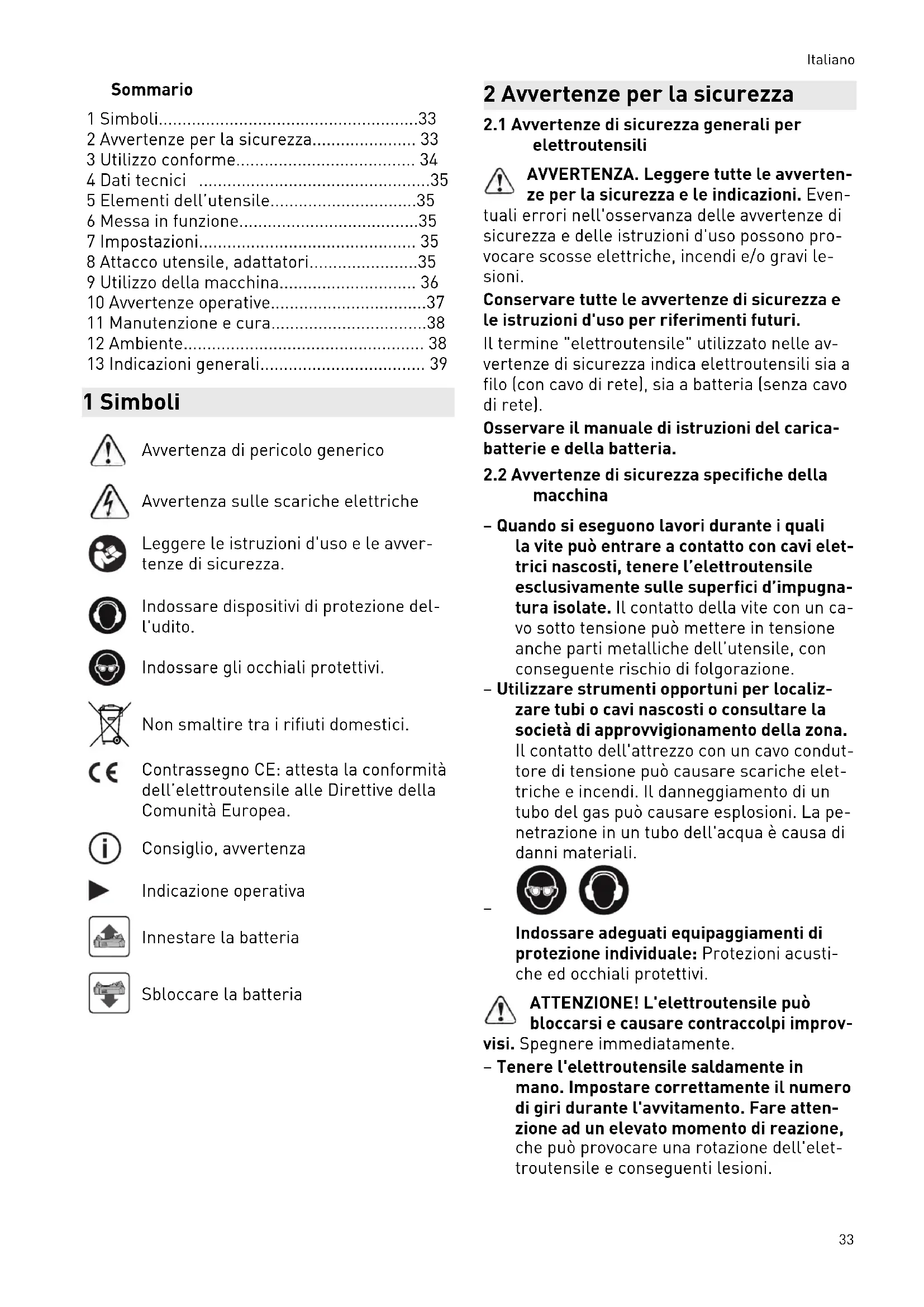 - 13 Indicazioni generali 1 Simboli Avvertenza di pericolo generico Avvertenza sulle scariche elettriche Leggere le istruzioni d'uso e le avver tenze di sicurezza. Indossare dispositivi di protezione del l'udito. Indossare gli occhiali protettivi. Non smaltire tra i rifiuti domestici. Contrassegno CE: attesta la conformità dell’elettroutensile alle Direttive della Comunità Europea. Consiglio, avvertenza Indicazione operativa Innestare la batteria Sbloccare la batteria 2 Avvertenze per la sicurezza p. 39