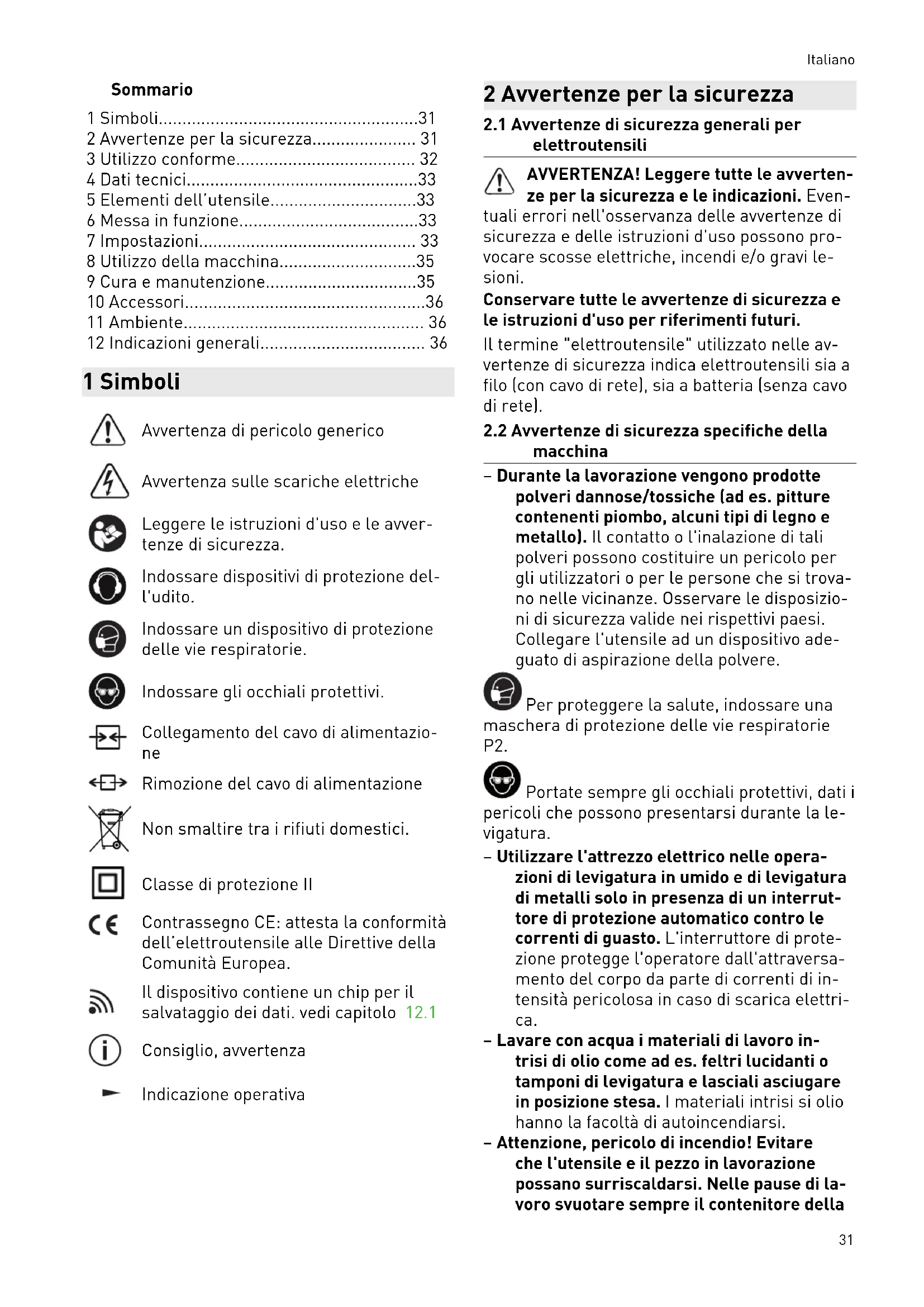 Rimozione del cavo di alimentazione Non smaltire tra i rifiuti domestici. Classe di protezione II Contrassegno CE: attesta la conformità dell’elettroutensile alle Direttive della Comunità Europea. Il dispositivo contiene un chip per il salvataggio dei dati. vedi capitolo 12.1 Consiglio, avvertenza Indicazione operativa 2 Avvertenze per la sicurezza