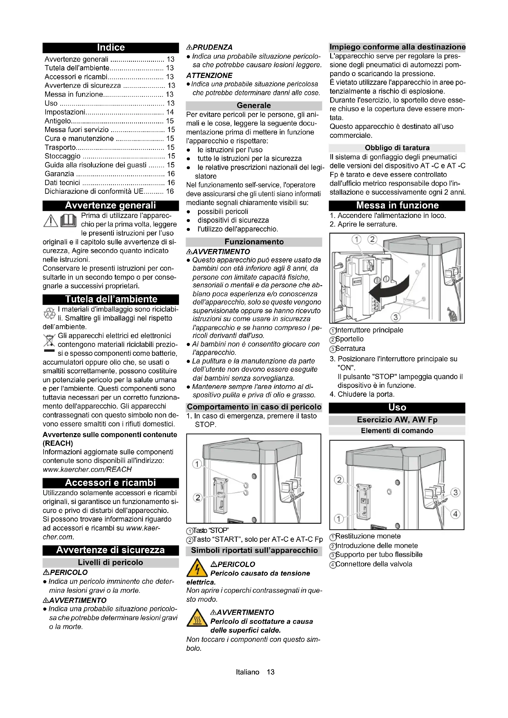 STOP. 1 Tasto “STOP” 2 Tasto “START”, solo per AT-C e AT-C Fp Simboli riportati sull’apparecchio PERICOLO Pericolo causato da tensione elettrica. Non aprire i coperchi contrassegnati in que- sto modo. 몇AVVERTIMENTO Pericolo di scottature a causa delle superfici calde. Non toccare i componenti con questo sim- bolo. Impiego conforme alla destinazione L'apparecchio serve per regolare la pres- sione degli pneumatici di automezzi pom- pando o scaricando la pressione. È vietato utilizzare l'apparecchio in aree po- tenzialmente a rischio di esplosione. Durante l'esercizio, lo sportello deve esse- re chiuso e la copertura deve essere mon- tata. Questo apparecchio è destinato all’uso commerciale. Obbligo di taratura Il sistema di gonfiaggio degli pneumatici delle versioni del dispositivo AT -C e AT -C Fp è tarato e deve essere controllato dall'ufficio metrico responsabile dopo l'in- stallazione e successivamente ogni 2 anni. Messa in funzione