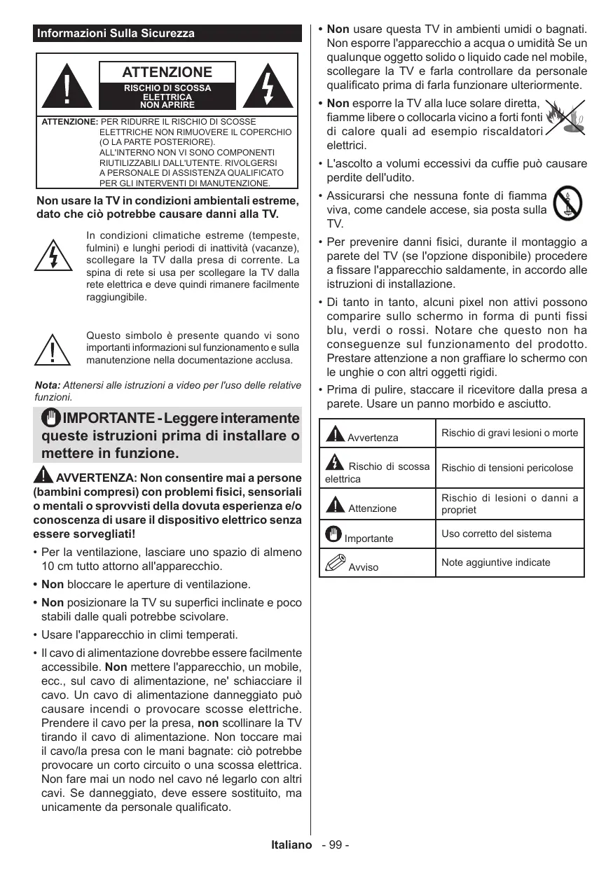 • Non esporre la TV alla luce solare diretta, fiamme libere o collocarla vicino a forti fonti di calore quali ad esempio riscaldatori elettrici. • L'ascolto a volumi eccessivi da cuffie può causare perdite dell'udito. • Assicurarsi che nessuna fonte di fiamma viva, come candele accese, sia posta sulla TV. • Per prevenire danni fisici, durante il montaggio a parete del TV (se l'opzione disponibile) procedere a fissare l'apparecchio saldamente, in accordo alle istruzioni di installazione. • Di tanto in tanto, alcuni pixel non attivi possono comparire sullo schermo in forma di punti fissi blu, verdi o rossi. Notare che questo non ha conseguenze sul funzionamento del prodotto. Prestare attenzione a non graffiare lo schermo con le unghie o con altri oggetti rigidi. • Prima di pulire, staccare il ricevitore dalla presa a parete. Usare un panno morbido e asciutto. Avvertenza Rischio di scossa elettrica Attenzione Importante Avviso