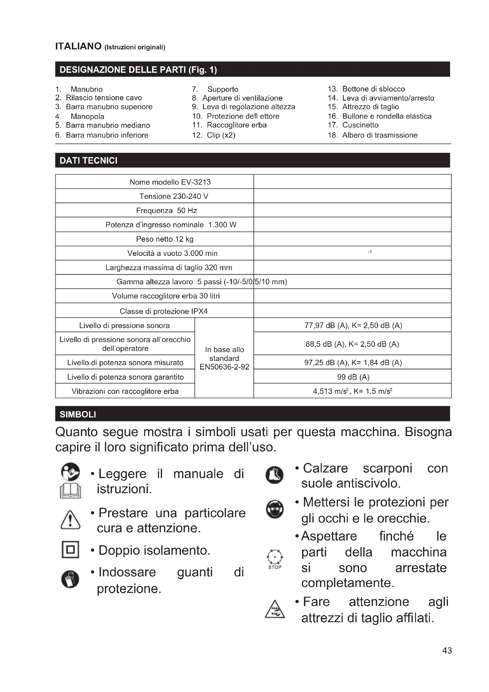 Larghezza massima di taglio 320 mm Gamma altezza lavoro 5 passi (-10/-5/0/5/10 mm) Volume raccoglitore erba 30 litri Classe di protezione IPX4 Livello di pressione sonora In base allo standard EN50636-2-92 77,97 dB (A), K= 2,50 dB (A) Livello di pressione sonora all’orecchio dell’operatore 88,5 dB (A), K= 2,50 dB (A) Livello di potenza sonora misurato 97,25 dB (A), K= 1,84 dB (A) Livello di potenza sonora garantito 99 dB (A) Vibrazioni con raccoglitore erba 4,513 m/s