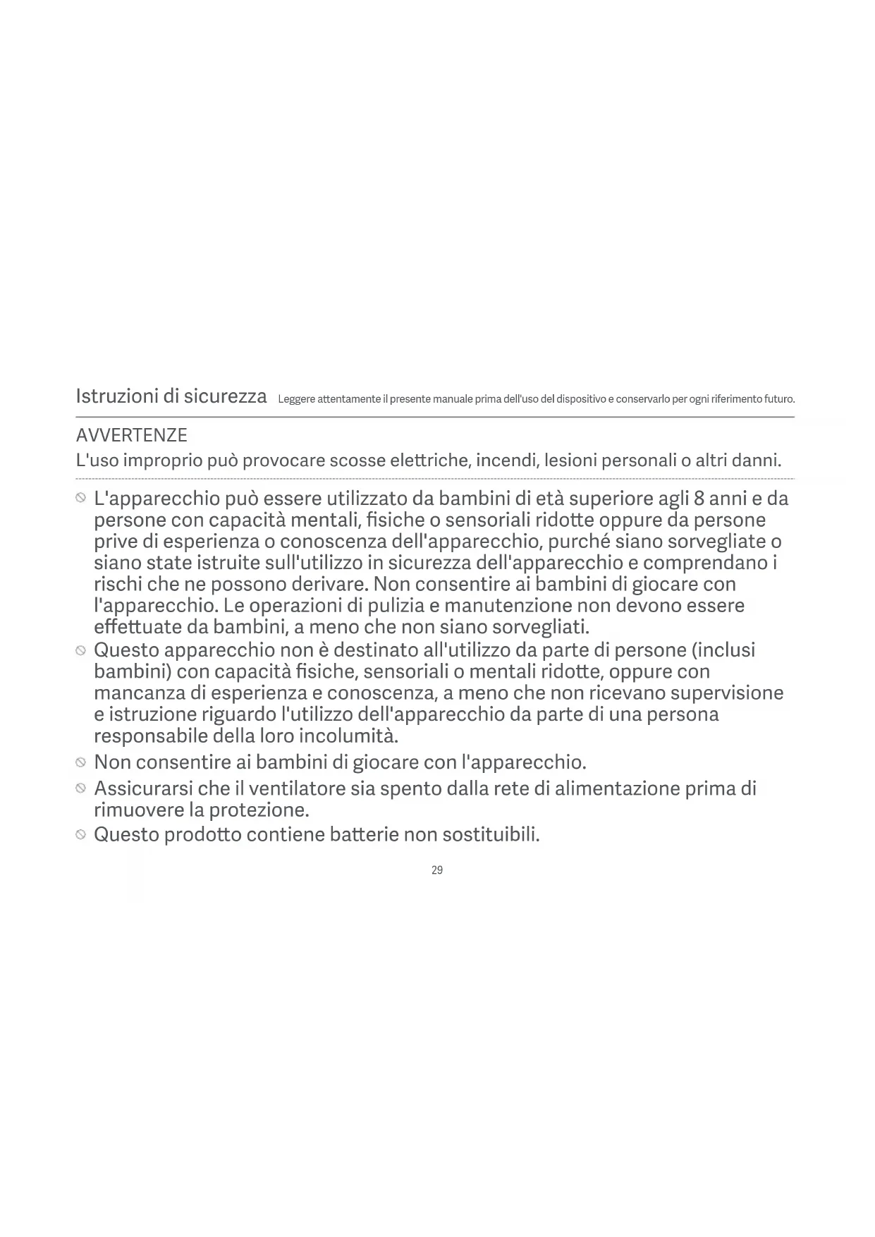 L'apparecchio può essere utilizzato da bambini di età superiore agli 8 anni e da persone con capacità mentali, fisiche o sensoriali ridoe oppure da persone prive di esperienza o conoscenza dell'apparecchio, purché siano sorvegliate o siano state istruite sull'utilizzo in sicurezza dell'apparecchio e comprendano i rischi che ne possono derivare. Non consentire ai bambini di giocare con l'apparecchio. Le operazioni di pulizia e manutenzione non devono essere effeuate da bambini, a meno che non siano sorvegliati. Questo apparecchio non è destinato all'utilizzo da parte di persone (inclusi bambini) con capacità fisiche, sensoriali o mentali ridoe, oppure con mancanza di esperienza e conoscenza, a meno che non ricevano supervisione e istruzione riguardo l'utilizzo dell'apparecchio da parte di una persona responsabile della loro incolumità. Non consentire ai bambini di giocare con l'apparecchio. Assicurarsi che il ventilatore sia spento dalla rete di alimentazione prima di rimuovere la protezione. Questo prodoo contiene baerie non sostituibili. L'uso improprio può provocare scosse eleriche, incendi, lesioni personali o altri danni. AVVERTENZEAVVERTENZA: Per ricaricare la baeria, utilizzare soltanto l'unità di alimentazione rimovibile <BLJ24W120200P-V> fornita con questo apparecchio. In condizioni d'uso normali, questa apparecchiatura deve essere tenuta a una distanza minima di 20 cm tra l'antenna e il corpo dell'utente. Questo apparecchio contiene una baeria agli ioni di litio incorporata. Non smontare, urtare, schiacciare la baeria o gearla nel fuoco. Se c'è un gonfiore rilevante, non continuare ad usarla. Non posizionare la baeria in ambienti caraerizzati da temperature elevate. Non utilizzare questo ventilatore se il suo cavo di alimentazione o la base di ricarica sono danneggiati o la sua spina è allentata. Non far funzionare nessun ventilatore con un cavo o una spina danneggiati. Disfarsi del ventilatore o restituirlo a un centro di assistenza autorizzato per un esame e/o una riparazione. Non utilizzare questo ventilatore in luoghi in cui è facile cadere o dove ci sono altri oggei instabili nelle vicinanze. Non tirare eccessivamente, torcere o piegare il cavo di alimentazione della base di ricarica, in quanto ciò potrebbe esporre o rompere il nucleo del cavo. 30Non inserire le dita o alcun oggeo nella griglia anteriore, nella griglia posteriore o nelle pale del ventilatore quando il ventilatore è in funzione. Tenere i capelli e i tessuti lontani dal ventilatore per evitare che si impiglino all'interno. Non utilizzare prese di corrente non idonee. Non utilizzare la base di ricarica fornita con questo ventilatore per nessun altro dispositivo. Smaltire le baerie esauste in modo correo. Le baerie usate devono essere geate in un centro di riciclaggio professionale. Non caricare il ventilatore su luoghi irregolari o su materiali felpati. In caso contrario, è facile che si verifichino guasti al circuito o incendi a causa del caivo contao tra la base di ricarica e la porta di ricarica. Prima della pulizia e della manutenzione, è necessario scollegare l'apparecchio dalla rete elerica. 31Per evitare scosse eleriche, incendi, lesioni personali o altri danni, assicurarsi che la base del ventilatore sia installata per ultima. Aenersi scrupolosamente alle istruzioni per l'installazione nel manuale utente. Non accendere il ventilatore o collegarlo alla base di ricarica se non è stato completamente assemblato. Spegnere o scollegare il ventilatore prima di installarlo o smontarlo. Non toccare il pulsante acceso/spento per evitare che il ventilatore entri in funzione e causi pericoli. Installazione Tenere saldamente il supporto del ventilatore per evitare che cada e causi lesioni personali. Utilizzare il ventilatore Non appoggiarsi o inclinare il ventilatore mentre è in funzione. Per evitare danni al meccanismo interno non spingere ripetutamente la caloa del ventilatore. Interrompere immediatamente l'uso del ventilatore quando emee suoni insoliti, emee caivi odori, si surriscalda o ruota irregolarmente. Caricare il ventilatore Non scollegare la base di ricarica tirando direamente il cavo o muovendolo fuori dalla presa di corrente. Al contrario, tirare la spina. Quando la baeria è scarica, il ventilatore deve essere caricato il prima possibile. Per evitare che la baeria venga danneggiata, collegare tempestivamente la base di ricarica alla base del ventilatore. Non tentare di riparare la base di ricarica da soli se è danneggiata. Se la base di ricarica è danneggiata o roa, deve essere sostituita da una base originale acquistata dal produore o dal servizio di assistenza post-vendita. Quando il ventilatore è in carica, la base del ventilatore potrebbe riscaldarsi. Si raccomanda di caricare il ventilatore su materiali isolanti o in luoghi che non sono facilmente influenzati da fonti di calore, in modo da evitare che i luoghi in cui il ventilatore viene messo diventino scoloriti o deformati. Cura e manutenzione Durante la manutenzione e la pulizia del ventilatore, assicurarsi di rimuovere la base del ventilatore prima di rimuovere altre parti e di installare la base del ventilatore per ultima quando lo si installa. Assicurarsi che il ventilatore sia scollegato prima di rimuovere il coperchio di protezione. PRECAUZIONI Trasporto